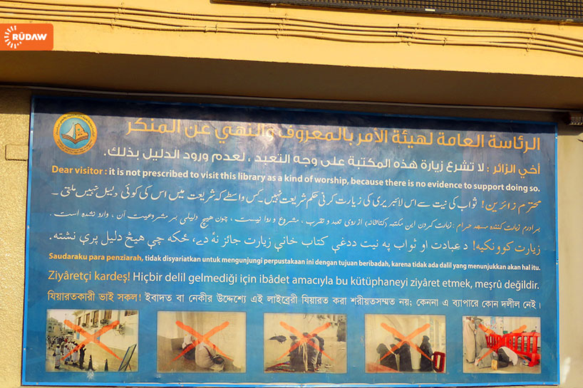 Herwiha rayedarên Erebistanê naxwazin ku geştyarên olî bi giringî ve berê xwe bidin wî cihî û ji bo ku ew kitêbxane weke cihekê pîroz neyê temaşekirin, pasevan danîne derdora avahiya wê kitêbxaneyê.