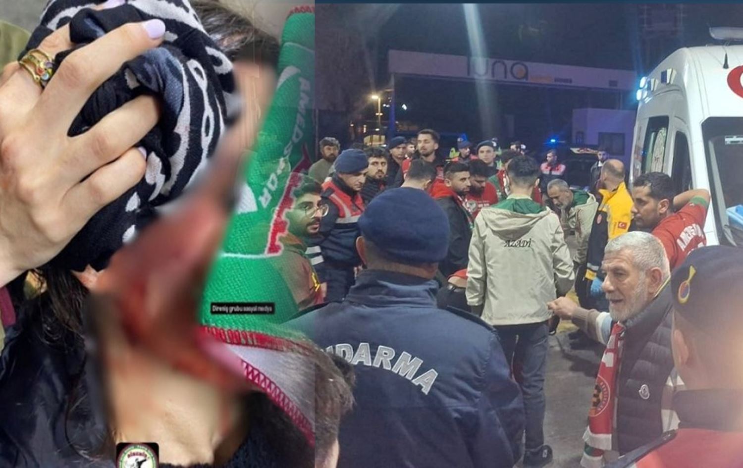 Di êrişê de Gulîzar Ozdemîra ku ji Aydinê ji bo piştgiriya Amedsporê çûbû stadyumê ji serê xwe birîndar bû.