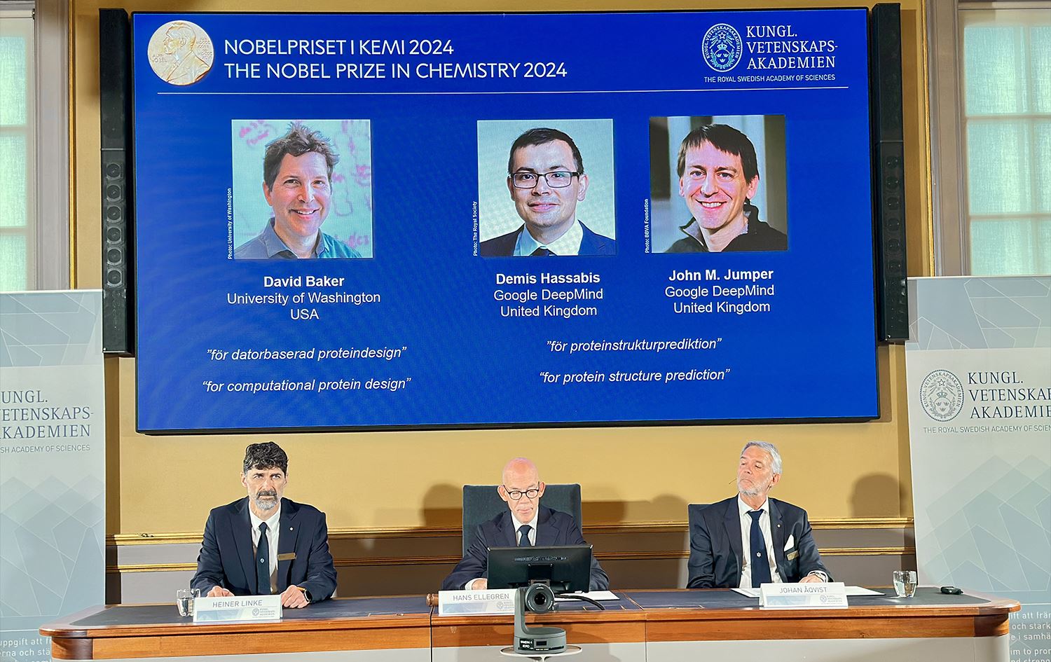 Hewlêr (Rûdaw) - David Baker ji bo xebata xwe ya "sêwirandina proteînê ya agahdariyê" û Demis Hassabis û John Jumper ji bo xebata xwe ya pêşbîniya têşeya proteînê" Xelata Nobelê ya Kîmyayê ya sala 2024an stand.