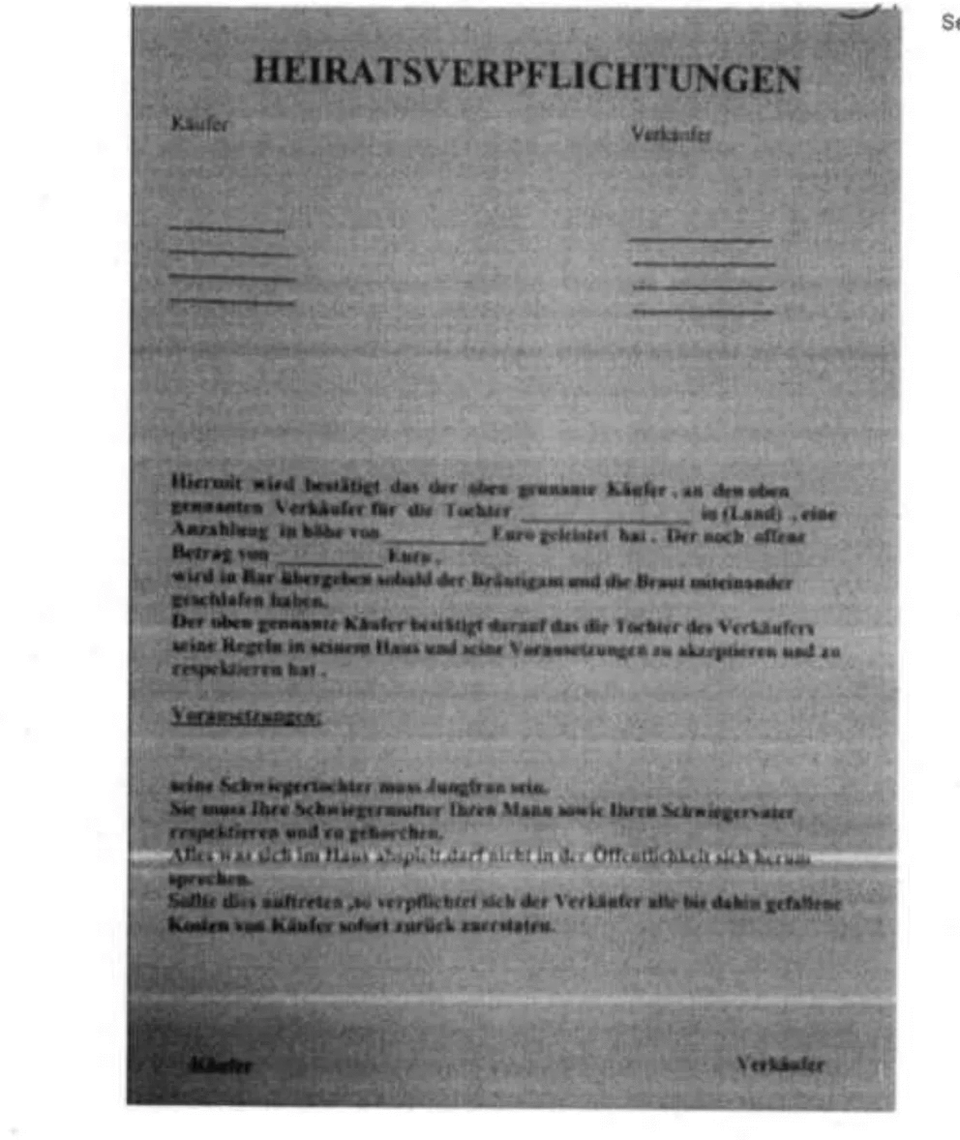 “Bi vê yekê tê piştrast kirin ku kesê kiryarê ku navê wî li jorê ye bo keçika bi navê (...) (...) euro pêşekî daye firokarê navborî. Dema ku zava û bûk bi hev re razên, (...) euroyê mayî jî dê bi dest were teslîm kirin. Divê bûka wî (...) bakîre be. Divê rêz û îtaetê ji xesû, mêr û xezûrê xwe re bigre. Nexwe kiryar dikare ji kirînê vekişe.”