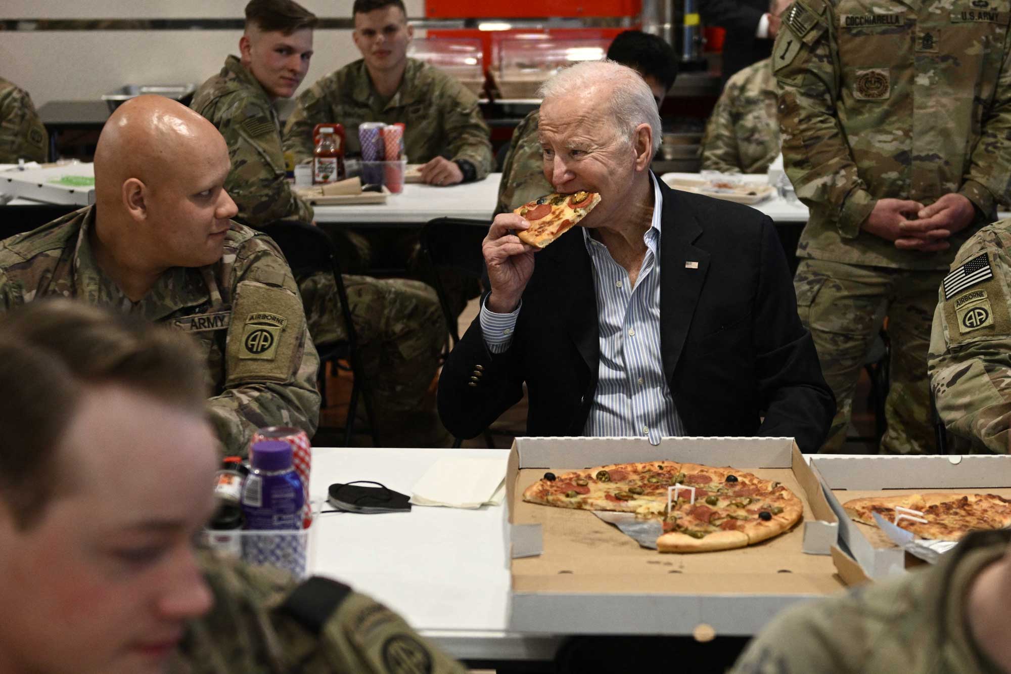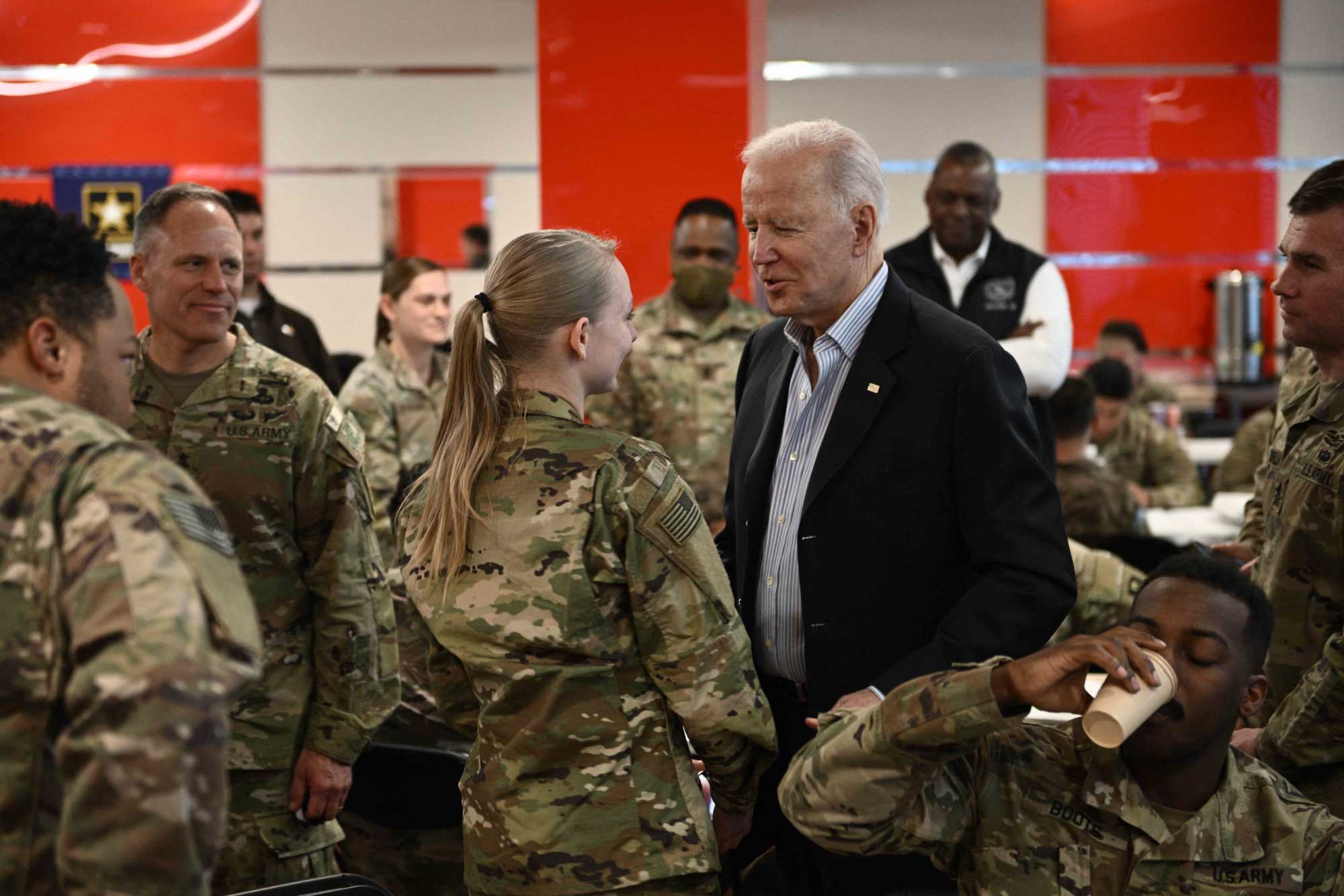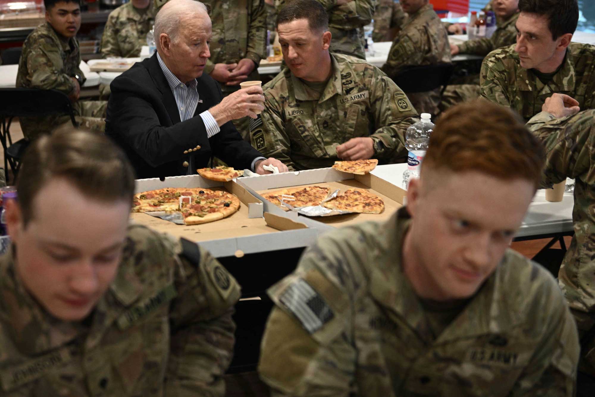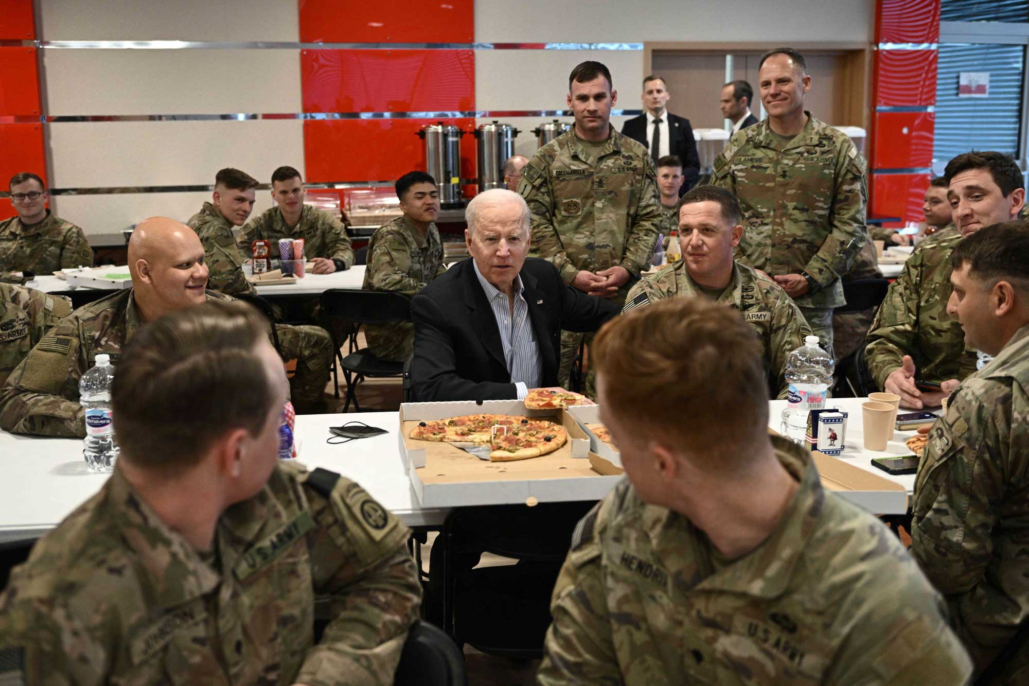Serokê Amerîkayê Joe Biden serdana baregeha leşkerî ya Rzeszow ya li başûrê rojhilatê Polandê kir. Joe Biden li wê derê bi leşkeran re li ser heman maseyê rûnişt û pîzza xwar. Piştre Biden axaftinek kir û ji leşkeran re got "parastina demokrasiyê erka we ye."