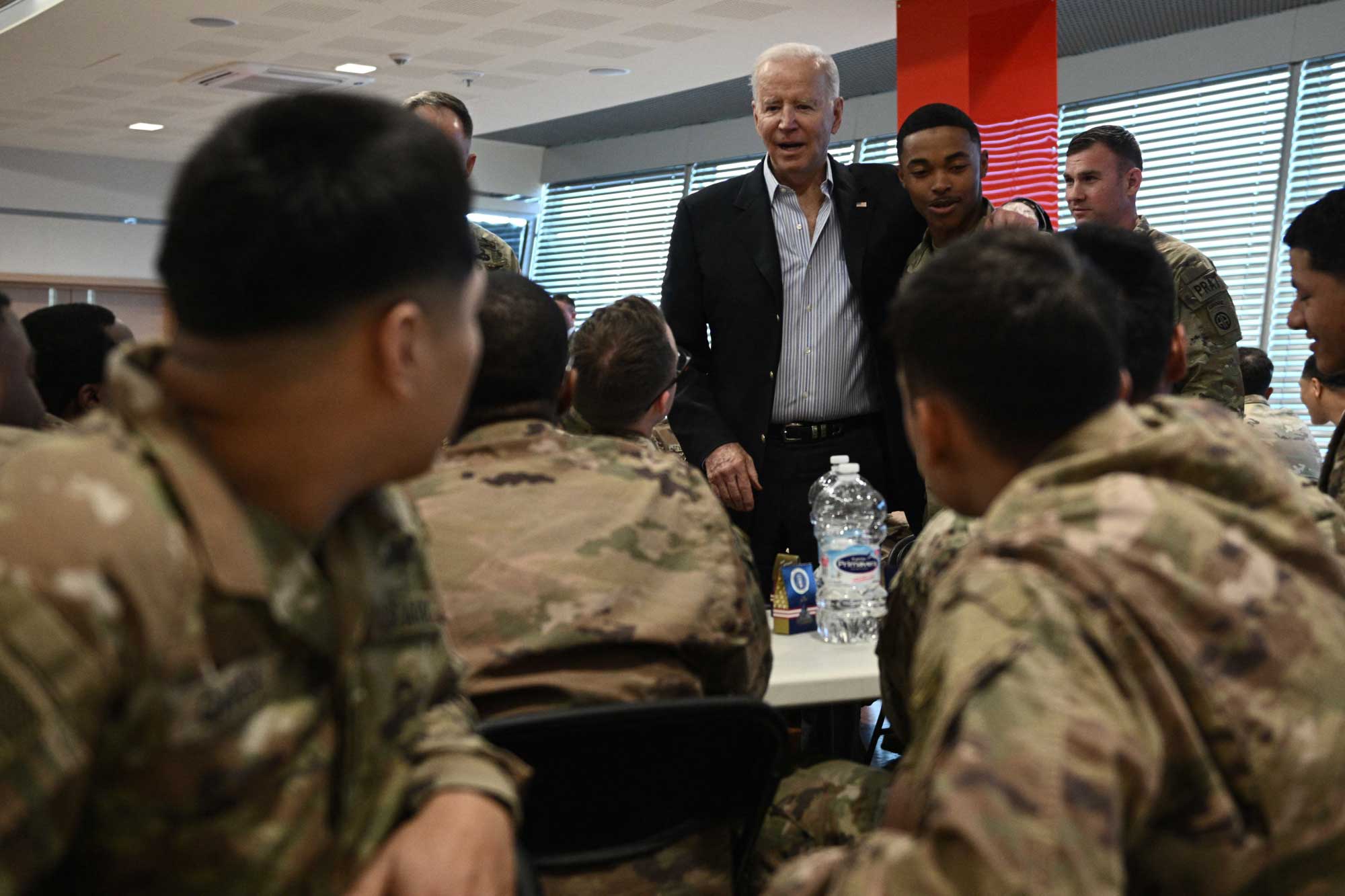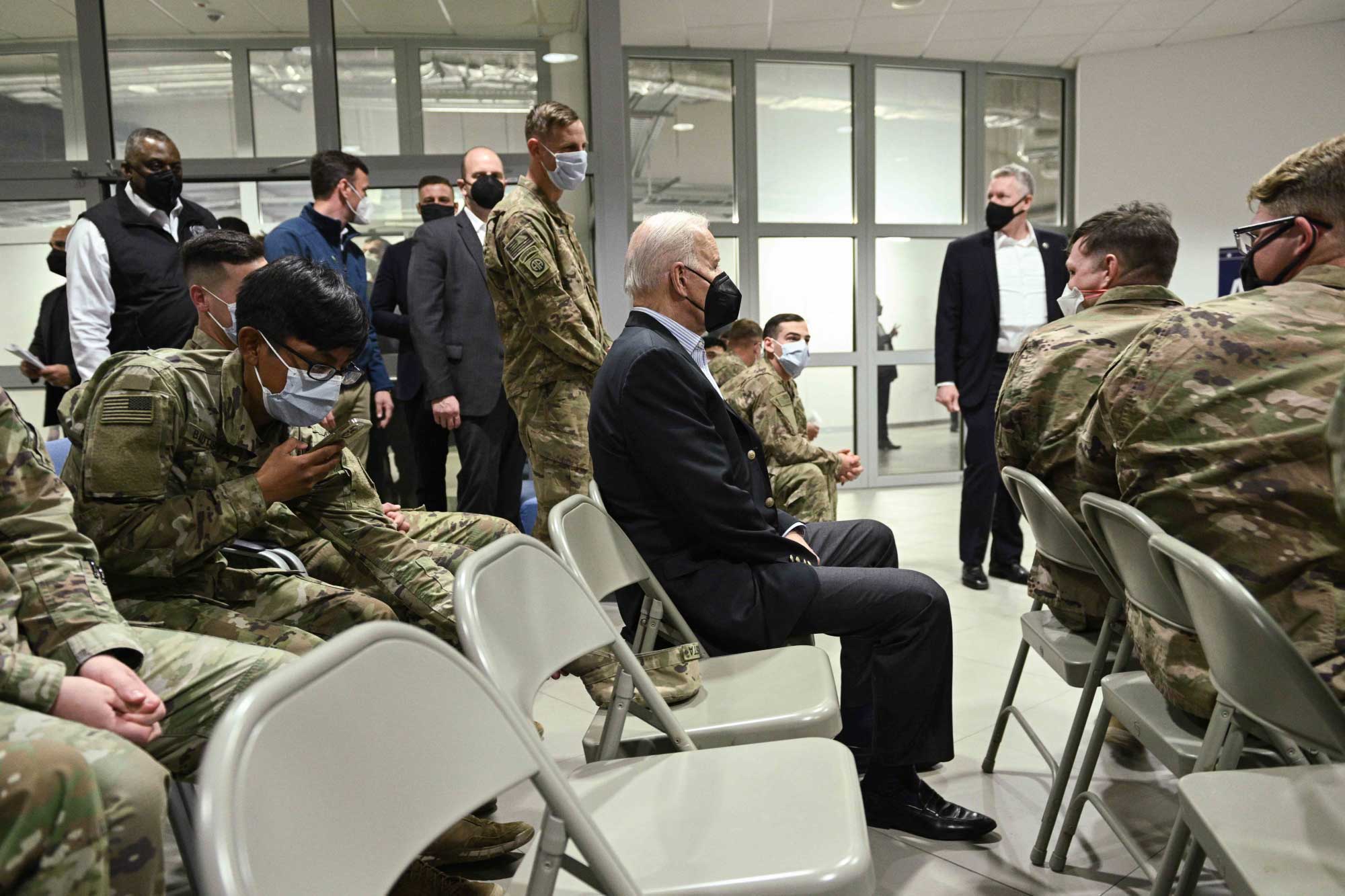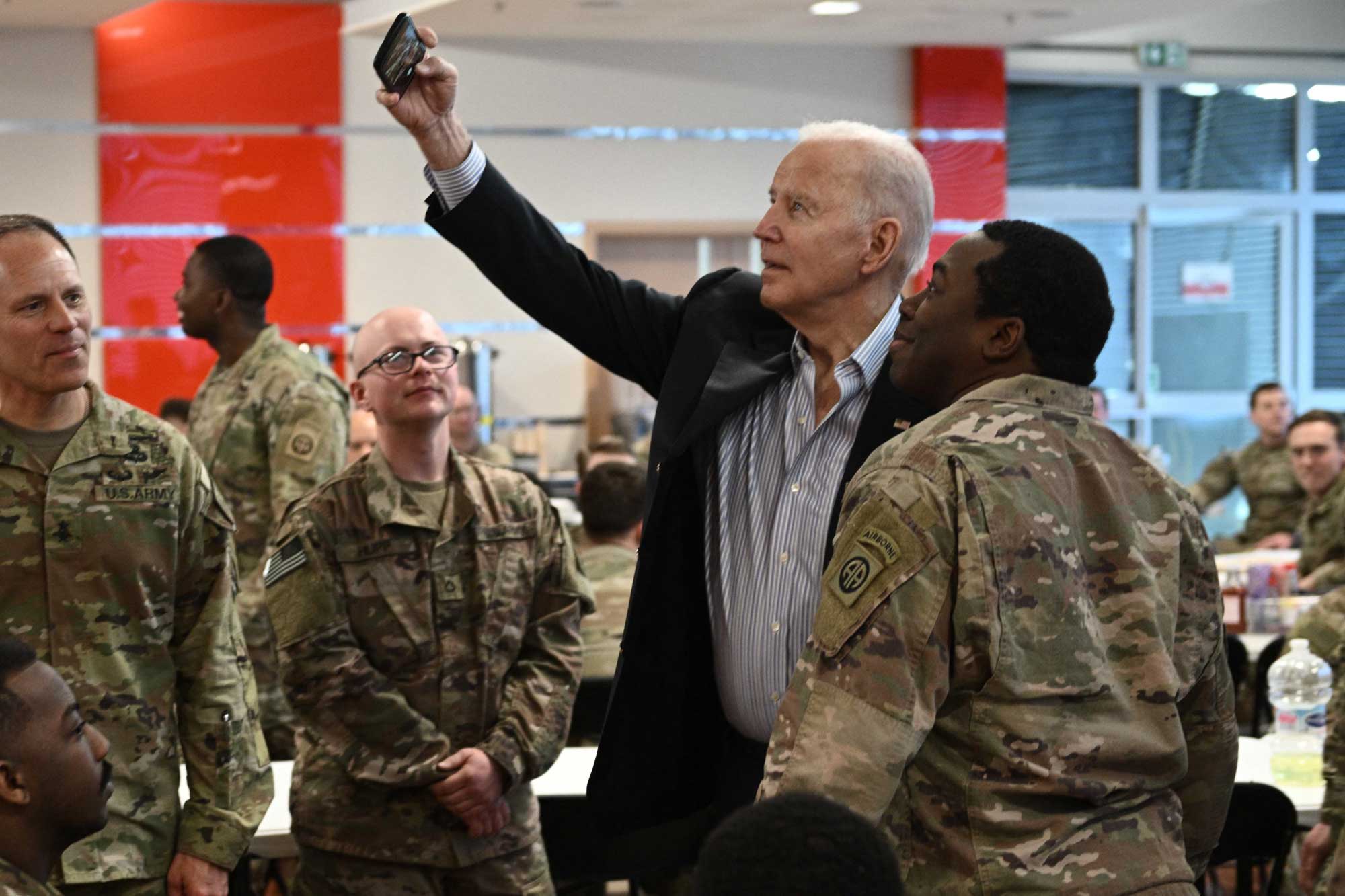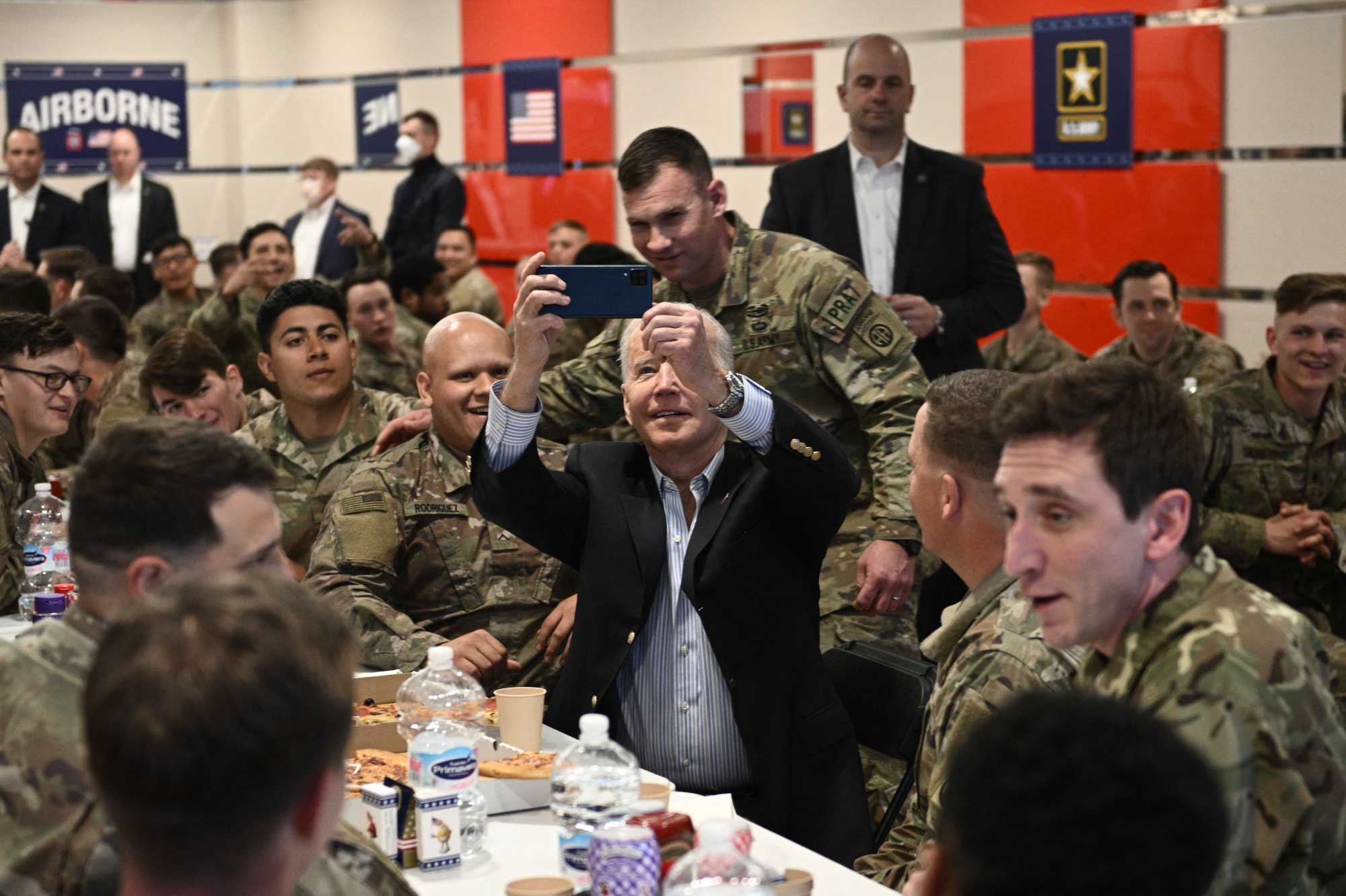 Serokê Amerîkayê Joe Biden serdana baregeha leşkerî ya Rzeszow ya li başûrê rojhilatê Polandê kir. Joe Biden li wê derê bi leşkeran re li ser heman maseyê rûnişt û pîzza xwar. Piştre Biden axaftinek kir û ji leşkeran re got "parastina demokrasiyê erka we ye."