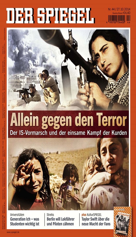 Manşeta vê hefteyê ya DER SPIEGELê, “Bi tenê li hemberî terorê. Pêşveçûna Dewleta Îslamî û şerê kurdan yê bi tena xwe.“ Li ser 11 rûpelên kovarê behsa şerê kurdan li hemberî rêxistinên îslamîst tê kirin.