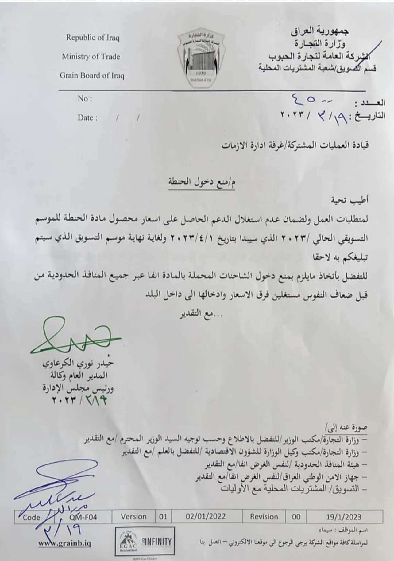حەیدەر نووری گەرعاوی، بەڕێوەبەری گشتیی بازرگانیی دانەوێڵە لە وەزارەتی بازرگانیی عێراق لەبارەی قەدەخەکردنی هێنانی گەنم لە دەرەوە نووسراوی فەرمی بۆ فەرماندەیی ئۆپەراسیۆنە هاوبەشەکان/ ژووری بەڕێوەبردنی قەیرەکان کردووە.