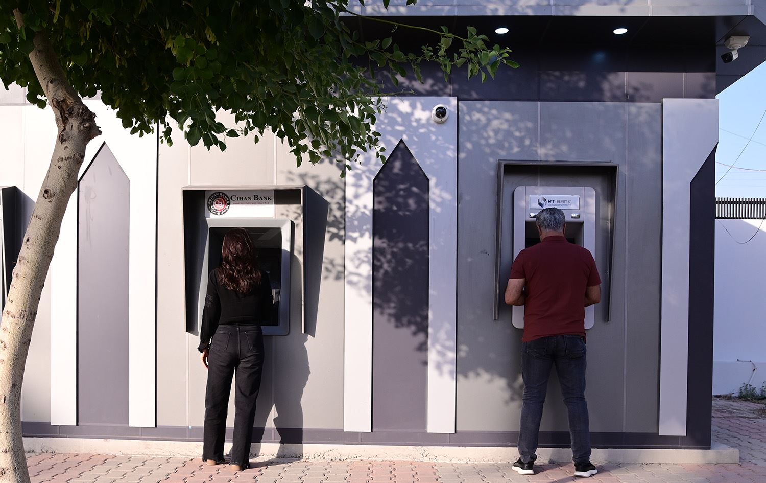 دوو فەرمانبەر لەکاتی راکێشانی مووچەکانیان لەڕێگەی ATMـی 'هەژماری من'، وێنە: بڵند تاهیر - رووداو