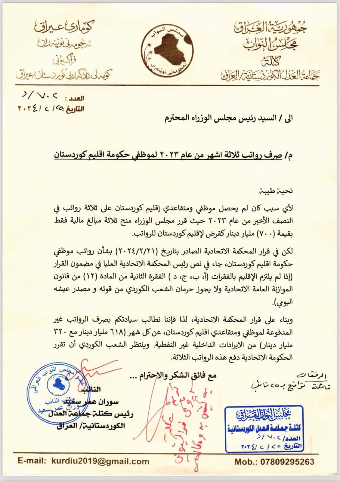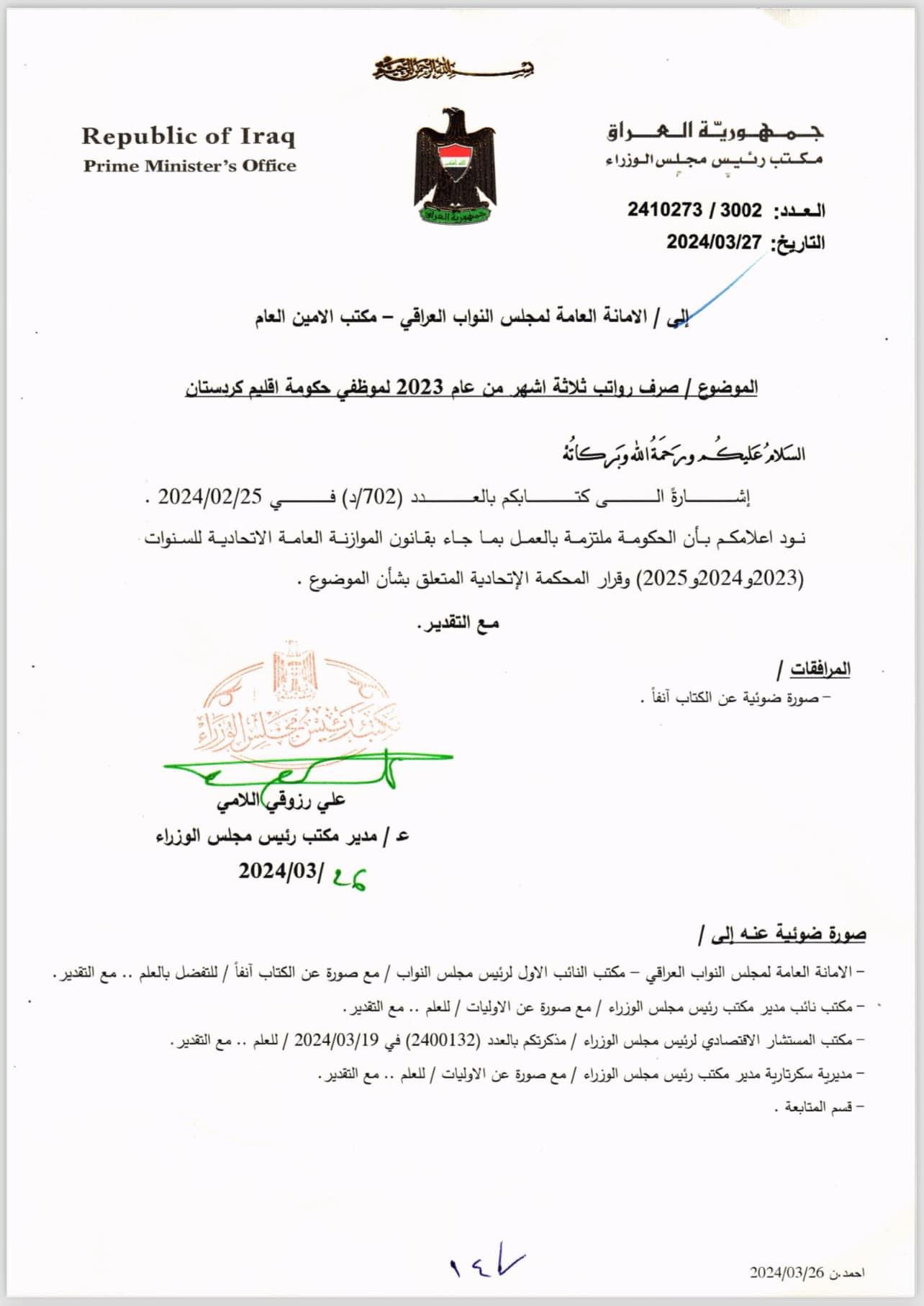 نووسینگەی محەممەد شیاع سوودانی، سەرۆکوەزیرانی عێراق نووسراوێکی لەبارەی مووچەی سێ مانگی کۆتایی ساڵی رابردوو، ئاراستەی ئەمینداریێتی گشتی ئەنجوومەنی وەزیران کرد.