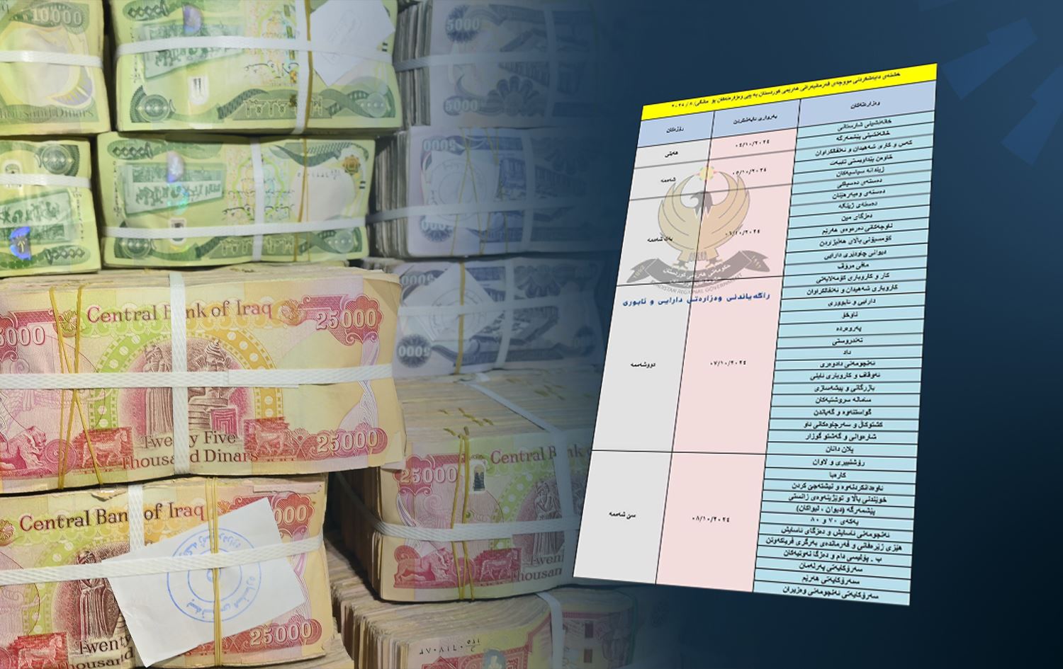 وەک لە راگەیێندراوەکەی بەیانیی ئەمڕۆ (پێنجشەممە، 3-10-2024)ـی وەزارەتی دارایی و ئابووریی حکومەتی هەرێمی کوردستاندا هاتووە، "رۆژی هەینی 4-10-2024 دابەشکردنی مووچە بە خانەنشینی شارستانی دەستپێدەکات و رۆژی سێشەممە 8-10-2024 بە سەرۆکایەتیی ئەنجوومەنی وەزیران کۆتایی دێت."