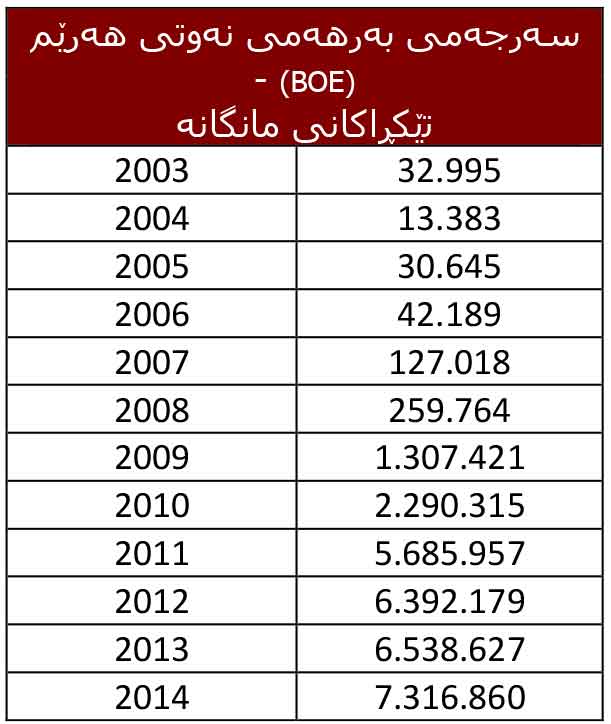 حكومەتی هەرێمی كوردستان لە ساڵی 2003ەوە دەستی بە بەرهەمهێنانی نەوت كردووە، كە ئەوكات لە مانگێكدا تەنیا 32 هەزار و 995 بەرمیل نەوتی بەرهەم هێناوە. بەڵام بەپێی دوایین ئامار بەرهەمی نەوتی كوردستان لە مانگی یەكی 2014 گەیشتووەتە 7 ملیۆن و 316 هەزار و 850 بەرمیل لە مانگێكدا. ئەم بڕەش دەكاتە 236,028 بەرمیل لە رۆژێكدا.