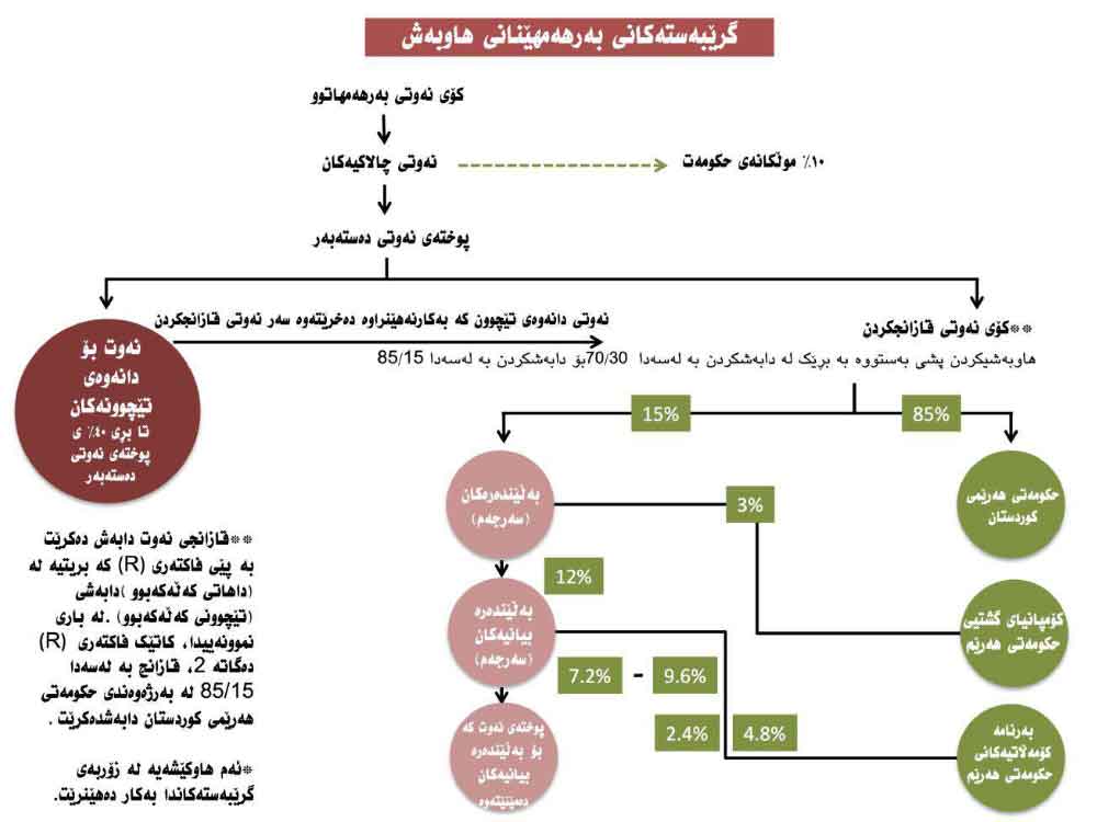 وەك لە روونكردنەوەكەی وەزارەتی سامانە سروشتییەكاندا هاتووە "بەپێی رێوشوێنی گرێبەستەكانی بەرهەمهێنانی هاوبەش، كۆمپانیای گەڕان و بەرهەمهێنان ریسكێكی دارایی لە ئەستۆ دەگرێت، تا ئەو كاتەی دۆزینەوەی (نەوت و غاز) بەدیدەهێنێت. ئەگەر دۆزینەوە بەدی نەیەت، هیچ تێچوونێك نادرێتەوە بە كۆمپانیای گەڕان و بەرهەمهێنان، بەڵام ئەگەر كۆمپانیاكە نەوتی دۆزییەوە و دەستی كرد بە بەرهەمهێنان، كۆمپانیاكە رێی پێدەدرێت پارەی نەوتی بەرهەمهاتوو بەكاربهێنێت بۆ دانەوەی تێچوون و خەرجی چالاكییەكانی. بەمەش دەڵێن: "نەوتی دانەوەی تێچوون". ئەو پارەیەی دەمێنێتەوە پێیدەڵێن (نەوتی قازانجكردن" و دابەش دەكرێت لە نێوان حكومەت و كۆمپانیاكەدا، كە لەباری نموونەییدا رێژەی 80%ی بۆ حكومەتە و رێژەی 20% بۆ كۆمپانیاكەیە، بەڵام لە هەرێمی كوردستان لە باری نموونەییدا نزیكەی رێژەی 90%ی بۆ حكومەتە.