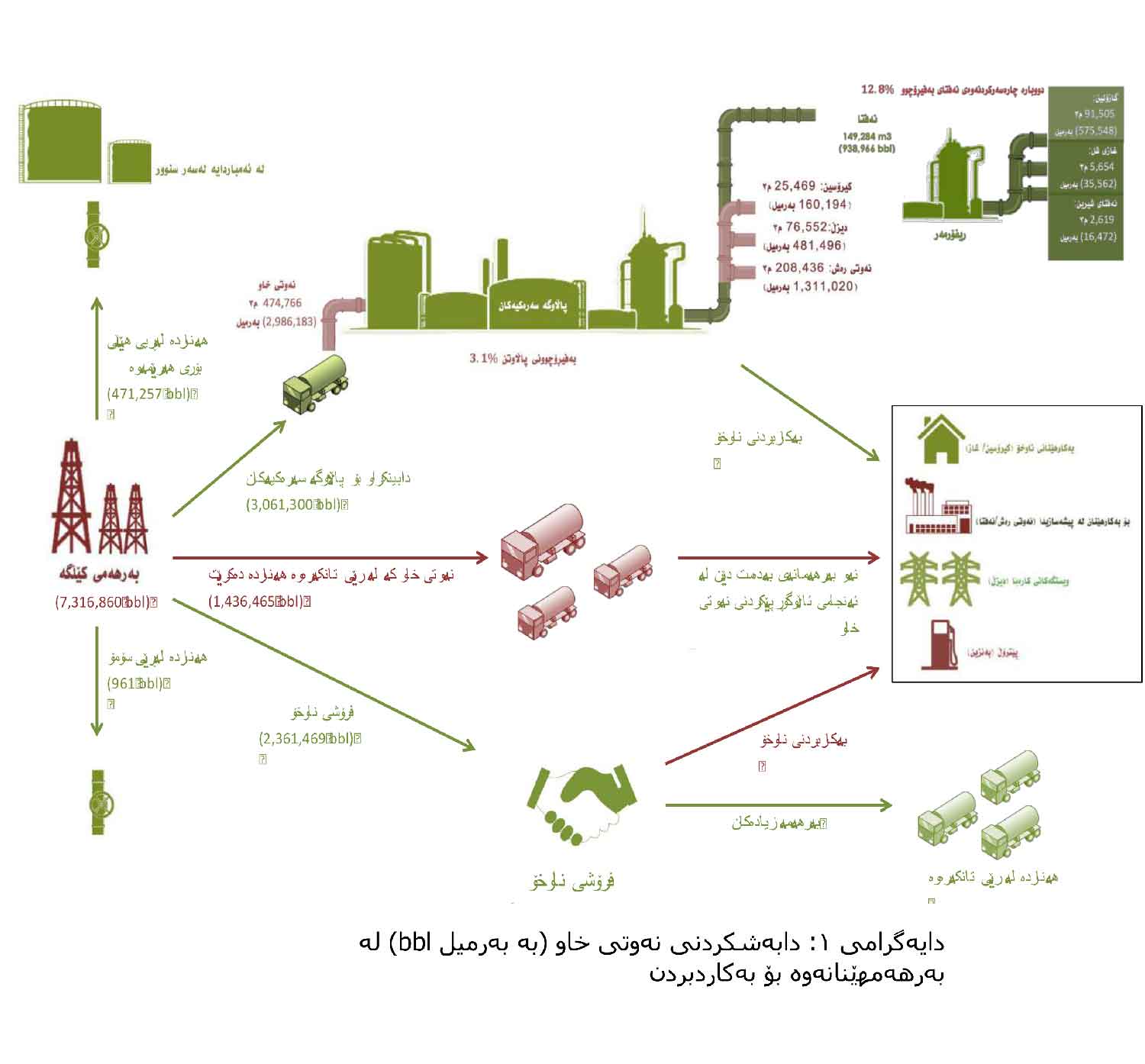 بەشێك لەو نەوتەی بەرهەمهاتووە نێردراوە بۆ پاڵاوگەكان، لەوانەش دی ئێن ئۆ 165,624 بەرمیلی ناردووە، خورمەڵە 1,852,082 بەرمیل و تی تی ئۆپكۆ 1,043,594 بەرمیلی ناردووە.