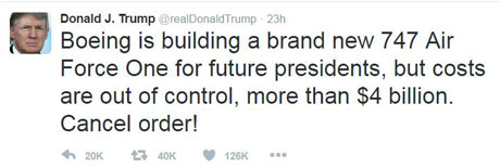 دۆناڵد ترەمپ، 20-1-2017 دەبێتە سەرۆکی ئەمریکا و، لەتوویتەکەدا ئاماژە بەوە دەکات کە "بۆینگ فڕۆکەیەکی سەرۆکایەتی (بۆینگ-747) کە لەهەموو رووێکەوە نوێیە دروستدەکات، بەڵام خەرجییەکەی زۆرە و دەگاتە زیاتر لە 4 ملیار دۆلار، بۆیە ئەو رێککەوتنە دەبێت هەڵبووەشێتەوە".
