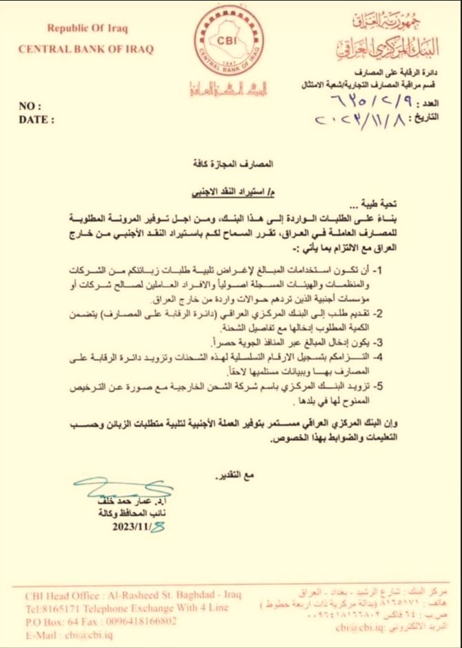 رۆژی 8ـی تشرینى دووەمى 2023، بانکى ناوەندیى عێراق نووسراوێکى ئاراستەى سەرجەم بانکە مۆڵەتپێدراوەکان کرد، کە تێیدا ئاماژەى بەوەداوە، 'نەرمى بەرامبەر هاوردەکردنى دراوى بیانى دەنوێنین.'