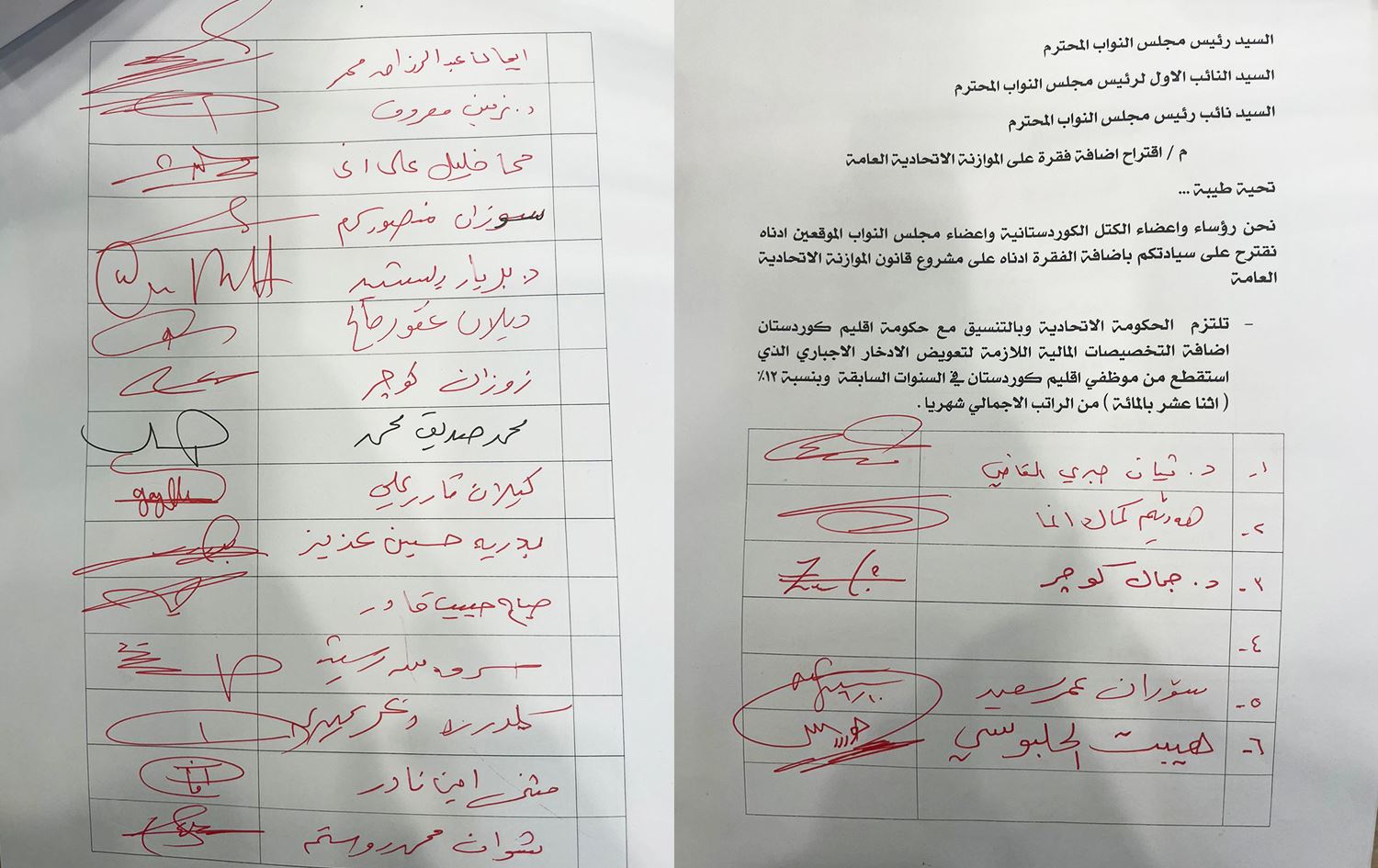 ئەندامێکی فراکسیۆنی پارتی دیموکراتی کوردستان رایگەیاند، فراکسیۆنەکانی پارتی، یەکێتی، یەکگرتوو و کۆمەڵی دادگەری واژۆیان لەسەر پێشنیازی گێڕانەوەی 12٪ـی پاشکەوتی مووچە کردووە و بە لیستێکی زیاتر لە 50 پەرلەمانتاری، پێشکێشی سەرۆکایەتی پەرلەمانی دەکەن بۆ ئەوەی بخرێتە نێو مادەی 14 و پەسەندبکرێت.