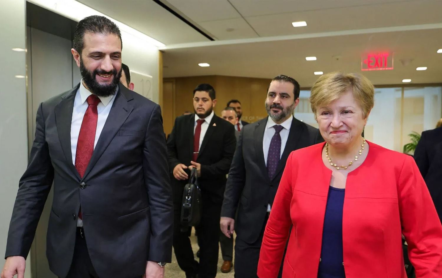 ئەحمەد شەرع، سەرۆککۆماری قۆناخی راگوزەری سووریا لە واشنتن لەگەڵ کریستالینا جۆرجیێڤا، بەڕێوەبەری سندووقی نێودەوڵەتیی دراو کۆبووەوە و بوارەکانی پێکەوە کارکردنیان بۆ پشتگیریکردن لە گەشەپێدانی ئابووریی سووریا تاوتوێ کرد.
