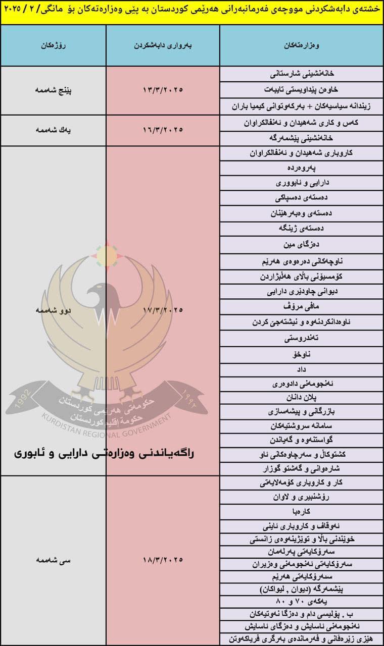 وەزارەتی دارایی و ئابووری هەرێمی کوردستان خشتەی مووچەی مانگی شوباتی بڵاوکردەوە و لە رۆژی پێنجشەممەوە دەست بە دابەشکردنی دەکرێت و یەکەم رۆژ مووچەی خانەنشینی شارستانی، خاوەن پێداویستی تایبەت، زیندانییانی سیاسی و بەرکەوتووانی کیمیایی دابەشدەکرێت.