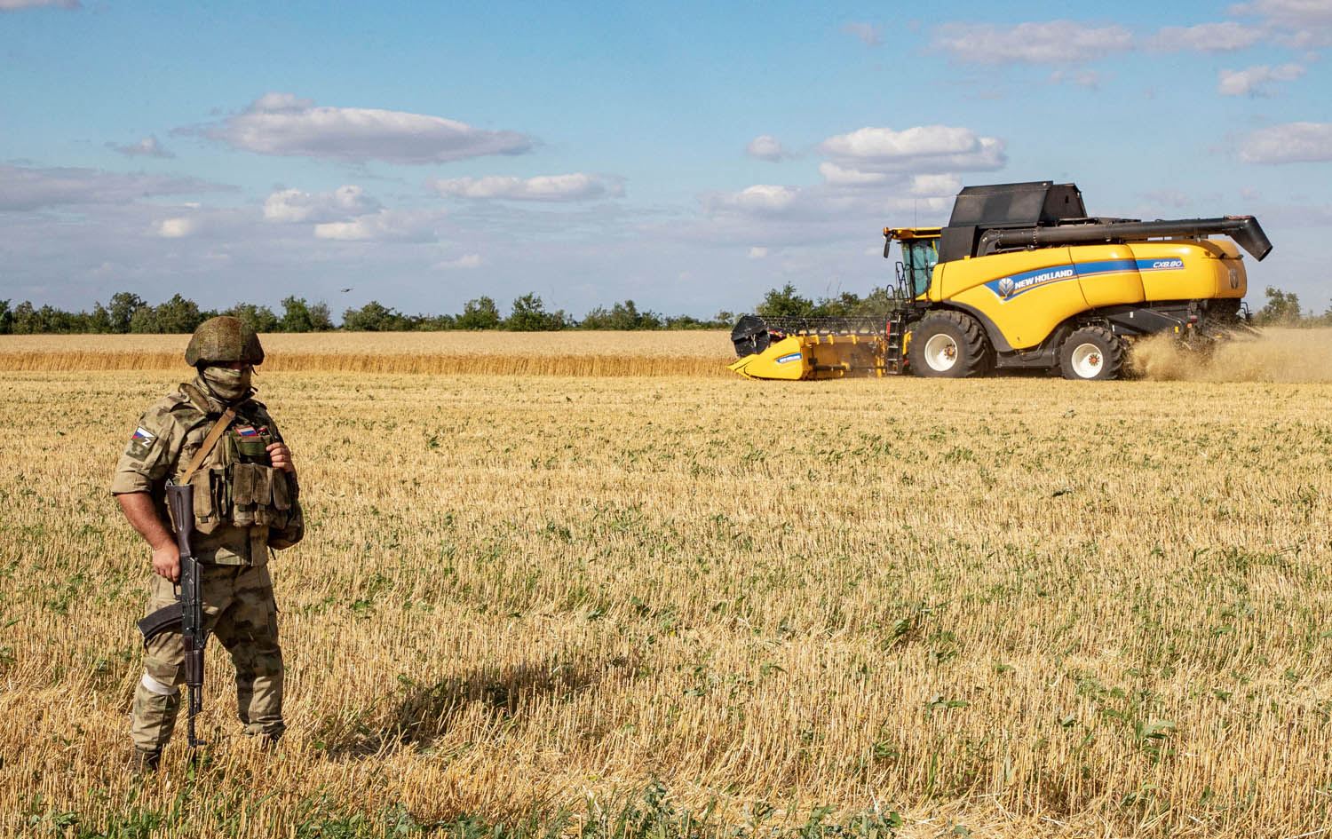 سەربازێکی رووسی لە کێڵگەیەک لەکاتی دوورینەوەی گەنمدا لە 14ـی تەممووزی 2022 لە ئۆکراینا، وێنە: Sergei Ilnitsky / EPA via Shutterstock