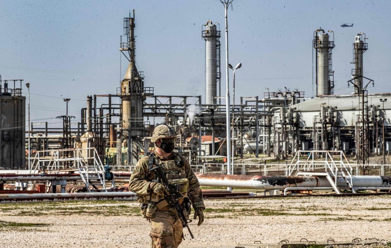 وێنەیەکی ئەرشیڤیی سەربازێکی ئەمریکی لەبەردەم بیرەنەوتەکانی سووەیدییە لە حەسەکەی رۆژئاوای کوردستان، وێنە: AFP