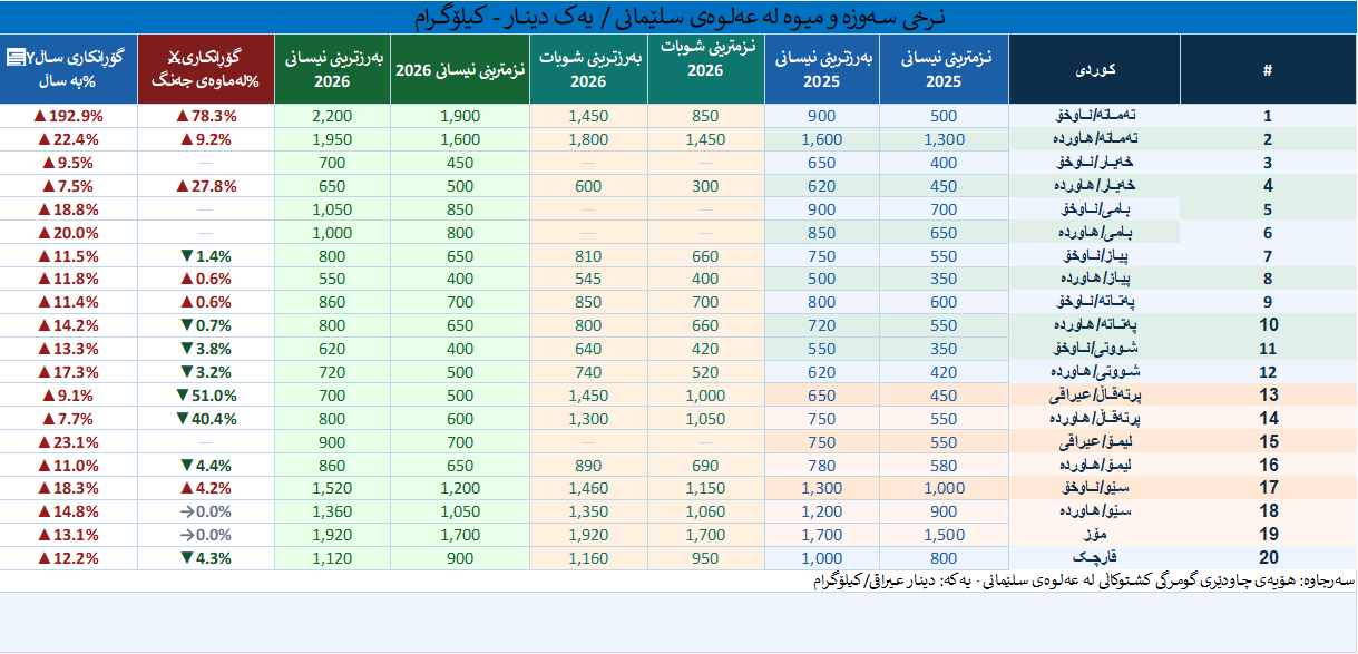 بەرزبوونەوەی ماددە خۆراکییەکان وەکو سەوزە و میوە لە مانگی ئادار 2026 لە عێراق و هەرێمی کوردستان هەبووە، بەشێوەیەک بەپێی نرخەکانی عەلوەکانی سلێمانی و هەولێر بۆ نزیکەی 71 بەرهەمی نێوخۆی و هاوردە نرخەکان گۆڕانی بەسەردا هاتووە و ئاراستەی هەندێک بەرهەم وەکو تەماتە، مۆز، شووتی، خەیار، بیبەری توون، ترۆزی و سێۆی سەوز لە هەولێر بە رێژەی 50٪ بۆ 18٪ بەرزبووەتەوە. لە بەرامبەردا لالەنگی، باینجان، فاسۆلیای تەڕ بە رێژەی 17٪ بۆ 51٪ دابەزیوە.