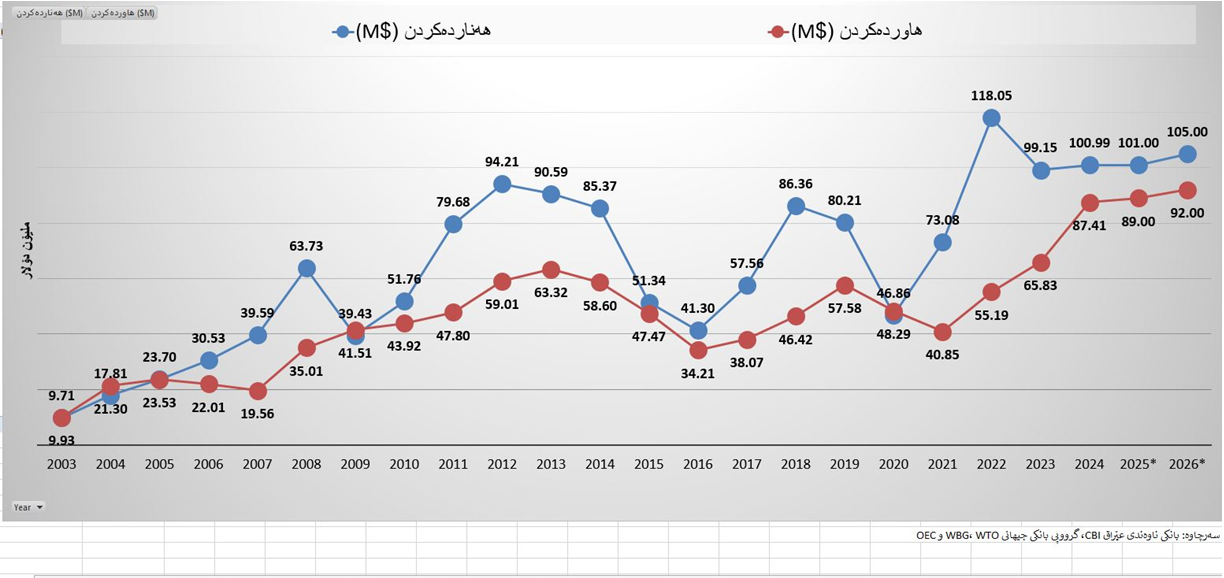 ساڵانی 2025 و 2026 بانکی ناوەندیی عێراق داتاکانی بڵاونەکردووەتەوە لەسەر بنەمای گرووپی بانکی جیهانی وەرگیراوە و 2026 خەمڵینراوە.