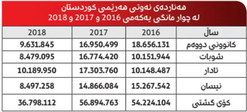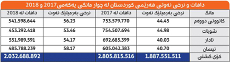 داهاتی نەوتی هەرێمی كوردستان لە ماوەی چوار مانگی یەكەمی ساڵی 2017 دوو ملیار و 805 ملیۆن و 815 هەزار و 516 دۆلار بووە، كە تێكڕای نرخی بەرمیلێك نەوت لەو چوار مانگەدا 42.54 بەرمیل بووە. بەڵام لە چوار مانگی ئەمساڵدا سەرەڕای بەرزبوونەوەی نرخی نەوت، داهاتی نەوتی كوردستان دابەزیوە بۆ دوو ملیار و 32 ملیۆن و 668 هەزار دۆلار. تێكڕای نرخی نەوت لە ماوەی ئەو چوار مانگەدا 55.50 دۆلار بووە بۆ یەك بەرمیل.