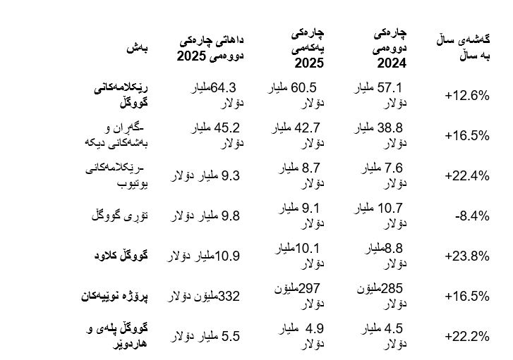 کۆمپانیای ئەلفابێت، کە خاوەنی گووگڵە، ئەنجامی دارایی بەهێزی بۆ چارەکی دووەمی 2025 راگەیاند. داهاتی سەرەکیی رێکلام و خزمەتگوزارییەکانی (کلاود)ـی کۆمپانیاکە بەرزبوونەوەیەکی بەرچاوی بەخۆیەوە بینیوە.