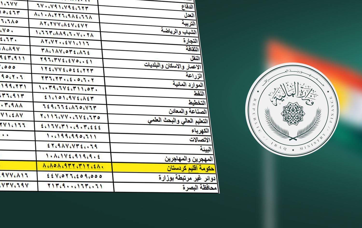 وەزارەتى دارایی عێراق لە 9 مانگدا 8.8 تریلیۆن دیناری لە پشکى هەرێمى کوردستان ناردووە، کە زیاتر لە 7.7 تریلیۆن دینارى بۆ مووچە بووە، تێکڕاى ئەو پارەیەى نێردراوە 9.3%ـی خەرجییەکانى عێراق بووە لەو ماوەیەدا.