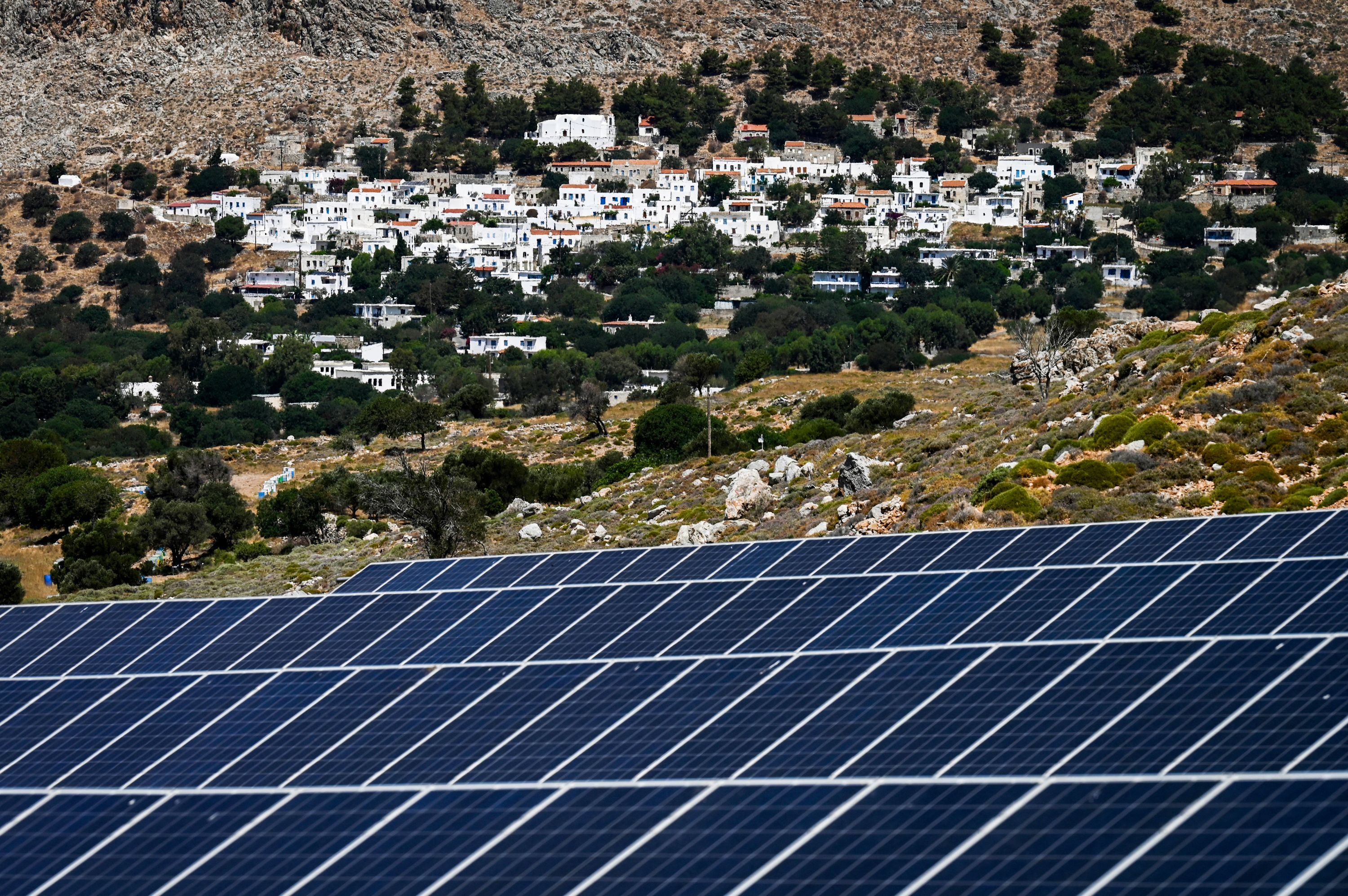 دوورگەی تیلۆس لە یۆنان و چەند پانێڵێکی بەرهەمهێنانی کارەبا لە وزەی خۆرەوە. وێنە: AFP / ARIS MESSINIS