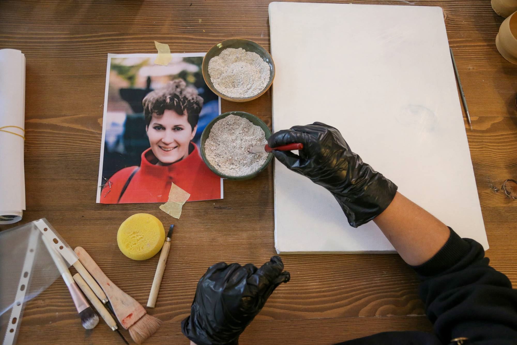 ئەو وێنەکێشە تورکە زۆرجار بۆ کێشانی تابلۆکانی خۆڵ بەکاردێنێت، بۆیە بیرۆکەی ئەوەی لا دروستبووە بە خۆڵەمێشی جەستەی سووتاوی کاتلین کۆلار، وێنەی ئەو ژنە کۆچکردووە بکێشێت.