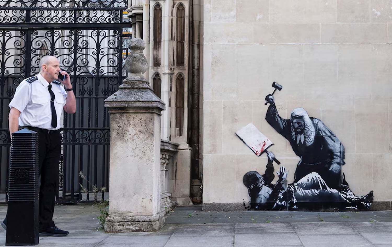 بەرپرسانی بەریتانیا رایانگەیاند، تابلۆیەکی نوێی سەر دیواری هونەرمەندی شەقامی ناسراو بە بانکسی لادەبەن، کە دادوەرێک نیشان دەدات بە چەکوشەکەی لە خۆپێشاندەرێکی بێچەک دەدات. تابلۆکە لەسەر دیواری دەرەوەی یەکێک لە ناسراوترین دادگەکانی لەندەن کێشراوە.