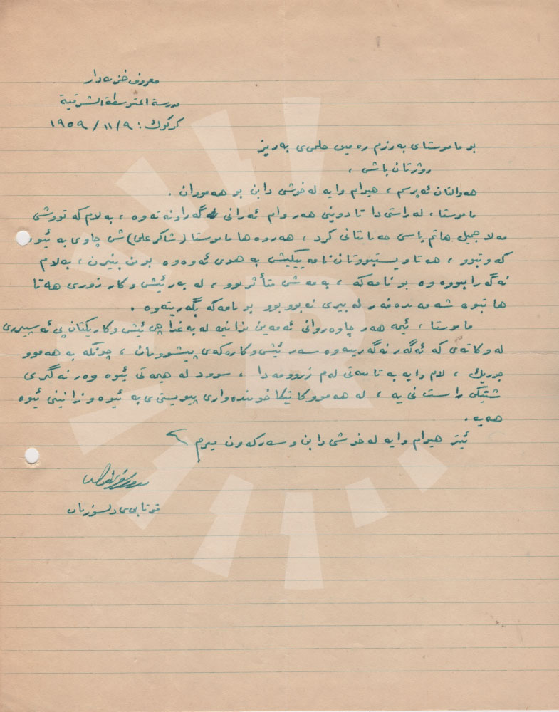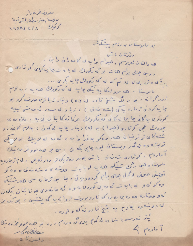ماموستا، هەموو ایمکانیەتێکی چاپ لە کەرکووک هەیە، بەڵام زۆر گرانە، بۆ بەڵگە شێخ قادر لە (٥٠) دینار زیاتری صرف کرد بو چاپکردنی ژمارە یەکی (شەفەق)، زیاد لەسەر ئەمەش تیپە کوردیی یەکانی چاپخانەکانی کەرکووک حرەکاتەکانیان نی یە. ملزەمەی بچوک حجمی کوڤاری (هیوا) بە (٧) دینار چاپ ئەکەن، بەڵام کاغەز و شتەکانی تر نرخیان هەر وەکو بەغدا وایە، ئەمە لە لاییک لە لایەکی تریشەوە ئەگەر ویستان لیرە چاپی بکەن، من بۆ هەموو خزمەتێک امادەم. گۆڤاری شەفەق پاش چەند رۆژیکی تر دەرئەچێ، لەم ژمارەیە ماموستا وهبی شتیکی هەیە لە بابەت ووشەی <<شەفەق>> وەکو تحقیقی صحفی لەگەڵ جمالی برام کردوویەتی، جا بو ژمارە سی (مەبەست ژمارە سێیە) هەر شتیکی وەکو ئەو لە بابەت ئەدەبی کوردی یەوە ئەمانەویت جەنابتان بیکەن، ئەو ووتارە عەرەبی یەی کە ناردبووت لەوانەیە گەیشتبی، چونکە من لە دوینەوە چاوم بە شیخ قادر نەکەوتووە،