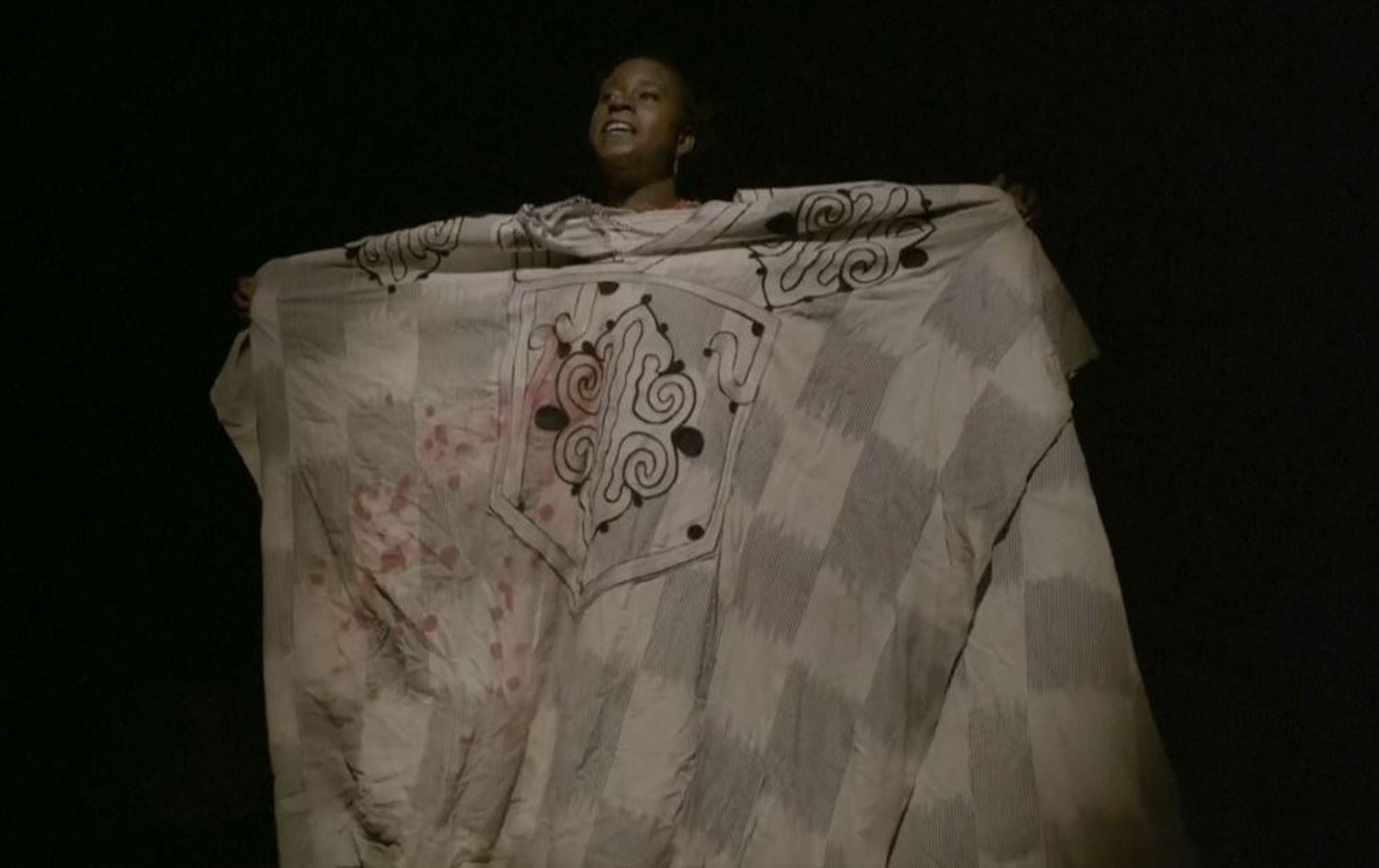 لە ژێر رووناکییەکی کەمدا لە ژوورێکی تاریکدا، ئۆلیڤیا ئۆدراوگۆ، پارچە قوماشێکی بە خوێنی بەدەستەوەیە.