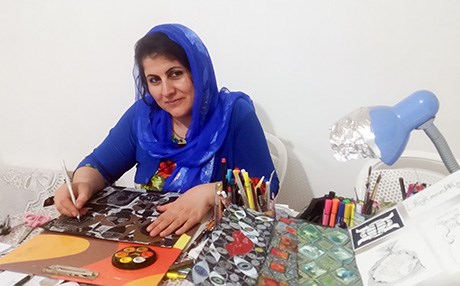 ستاوەند، بە جلوبەرگێكی كوردانەی شینی گوڵداری سوور و پەچەیەكی هاوڕەنگی خەتداری زێڕینی. بە دوو پەنجە قەڵەمە رەش و سپی و قاوەییەكەی دەجوڵێنێ و خەریكی وێنەكێشان دەبێت.
