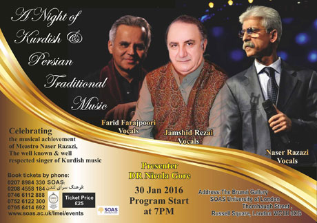 بەگوتەی فەرەجپووری لەو مەڕاسیمەدا "دوو بەشی میوزیکی فارسی و کوردی پێشکەش دەکرێت کە گۆرانیبێژی بەشی فارسیەکەی جەمشید رەزاییەوە و بەشی دووەمیش کە میوزیکی کوردی تێدا پێشکەش دەکرێت گۆرانیبێژەکانی ناسری رەزازی و فەرەید فەرەجپووری-ن گرووپەکەش چەند ژەنیارێکی بەناوبانگی وەک عارف ئیبراهیمپور و رزگار خۆشناوی تێدایە".