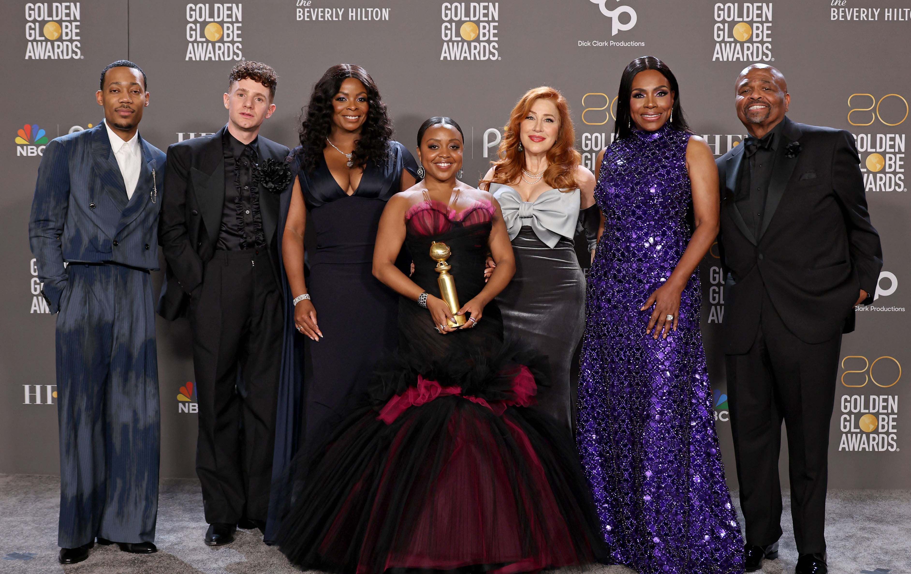 باشترین خانمە ئەکتەر لە زنجیرەی Abbott Elementary کە خەڵاتی بردەوە لەگەڵ ستافەکەی. وێنە: AFP
