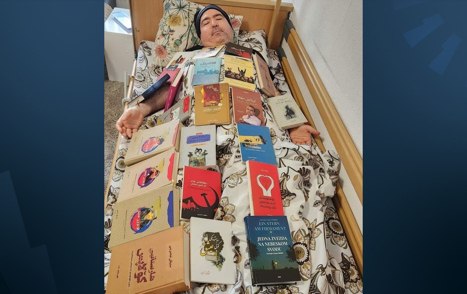 ستیڤان شەمزینی و بەرهەمەکانی لەو کاتەی تەندروستیی ناجێگیر بووە و لە نەخۆشخانە وێنەکە گیراوە..