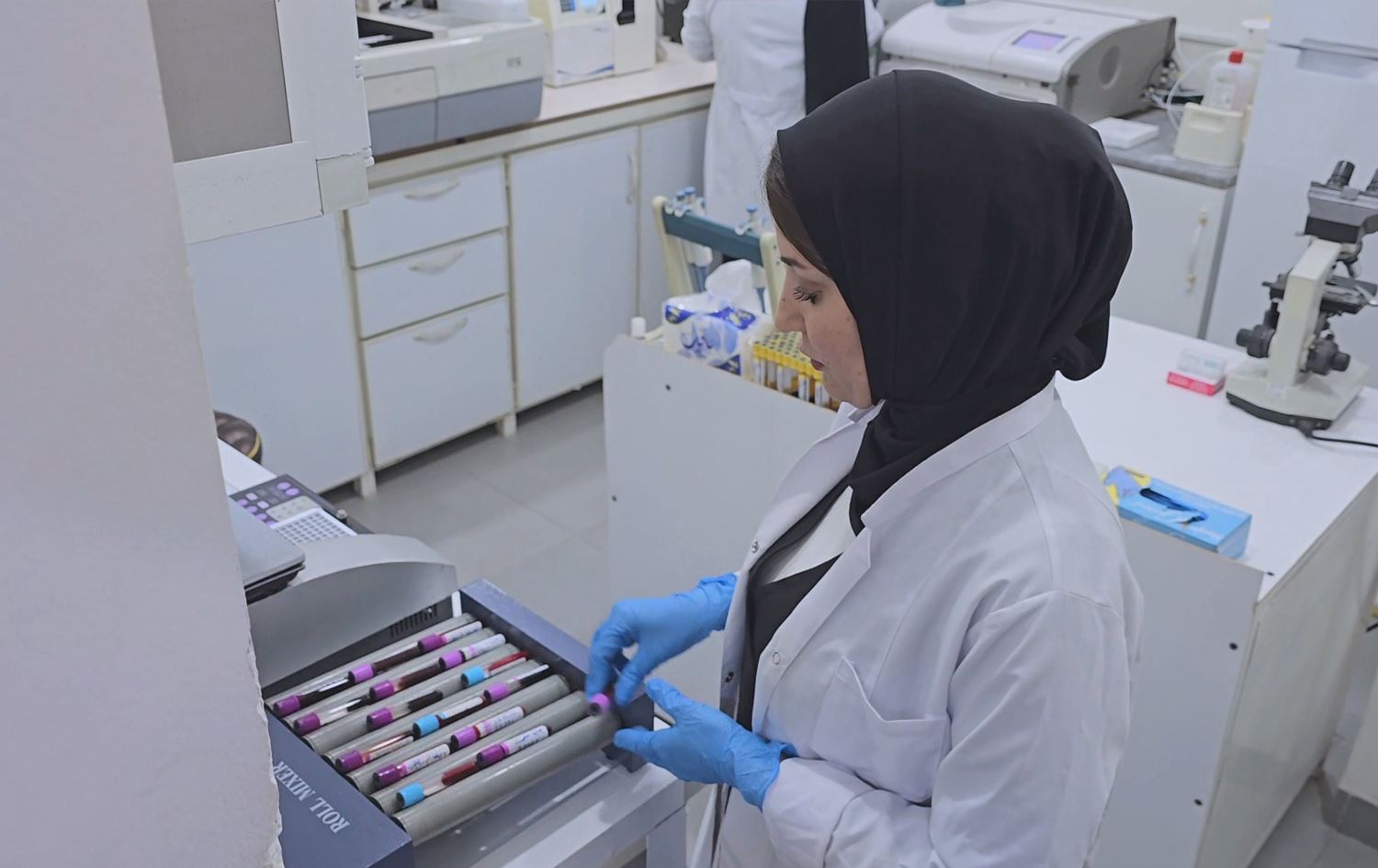 کارمەندێکی تەندروستی لەنێو تاقیگەیەکە و پشکنین دەکات. وێنە: بۆ روونکردنەوە لە تاقیگە دانراوە