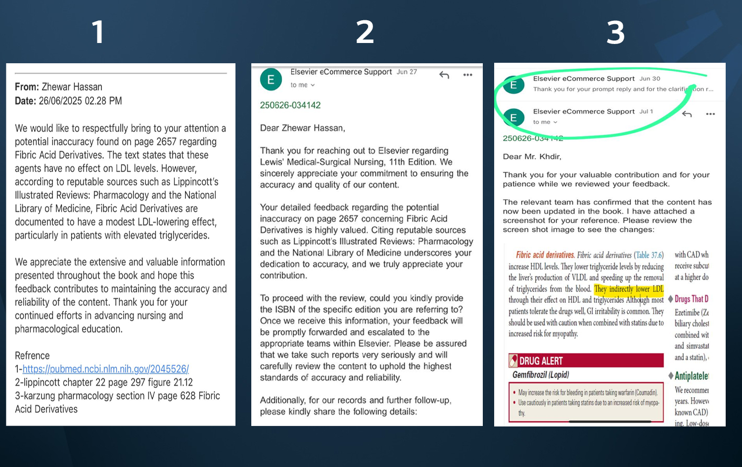 ژیوار حەسەن، خوێندکاری قۆناخی سێی کۆلێژی پەرستاریی زانکۆی راپەڕینە و هەڵەیەکی زانستی لە بەشی 33ـی کتێبی Lewis’s Medical-Surgical Nursing eleventh editioـی تایبەت بە بواری پەرستاری دۆزیوەتەوە، ئەو دەڵێت: لە کتێبەکە نووسرابوو کە دەرمانەکانی Fibric acid debriative پەیوەندییان نییە بە چەوریی LDLـەوە، بەڵام لە راستیدا کەمیی دەکاتەوە.