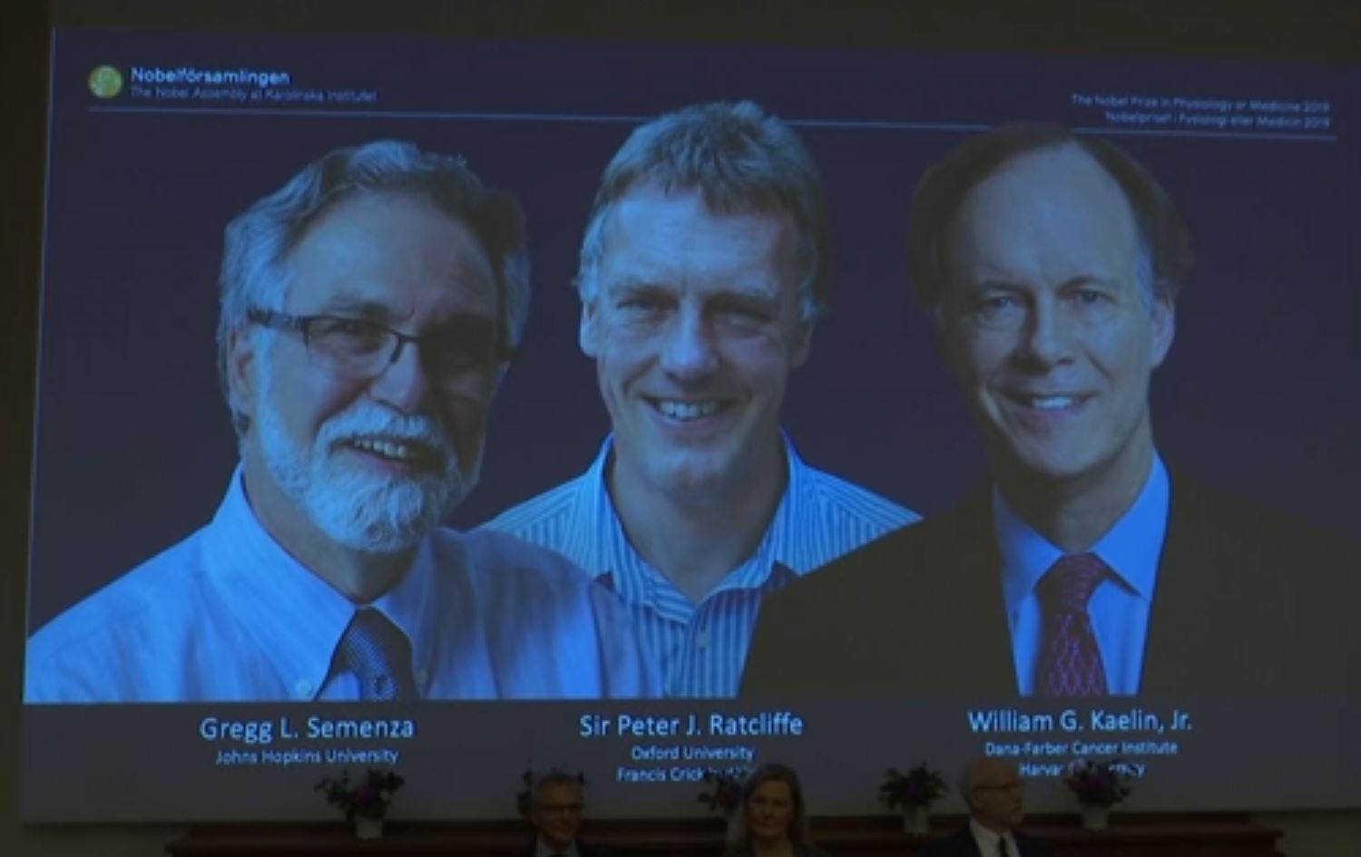 سکرتێری کۆمیتەی خەڵاتی نۆبڵ دەڵێت: "ئاهەنگی راگەیاندنی نۆبڵ لە پەیمانگەی کارۆلینسکا، ئەمڕۆ تێیدا بڕیاردرا بۆ ئەوەی خەڵاتی نۆبڵی پزیشكی یان فسیۆلۆژی ساڵی ٢٠١٩ بە هاوبەشی ببەخشێتە هەریەکە لە ویلیام کایلین، پیتەر راتکلیف، گرێگ سیمێنزا بۆ دزۆینەوەکانیان لەبواری ئەوەی کە خانەکان چۆن هەست دەکەن، هەروەها چۆن دەتوانن خۆیان لەگەڵ هەبوونی ئۆکسجین بگونجێنن، لێرە ئێستا ٣ نامەی خەڵاتی دڵخۆشکەرمان هەن، لەلای چەپەوە بۆ گرێگ سێمێنزا، کە لە ساڵی 1956 لە نیویۆڕک لەدایکبووە، ئەو توێژینەوە سەرکەوتووەکانی لە زانکۆی جۆن هۆپکینز لە بێلتمۆر ئەنجامداون، لەناوەڕاستدا پیتەر راتکلیف کە لە بەریتانیا لەدایکبووە و توێژینەوەکانی لە زانکۆی ئۆکسفۆرد ئەنجامداون و لەساڵی 1954ەوە بەردەوامە لە تێژینەوەکانی لەم زانکۆیە، هەروەها لەلای راست ویلیام کایلین، کە لەساڵی 1957 لە نیویۆڕک لەدایکبووە، توێژینەوەکانی لە پەیمانگەی توێژینەوە لە شێرپەنجەی دانا فاربەر لە بۆستن ئەنجامداون".