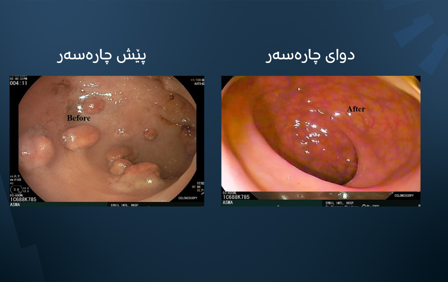 ئەمەی خوارەوە هەناوبینیی کۆڵۆنی ئەو خانمە 30 ساڵەیە کە تووشی دروستبوونی گرێی کۆڵۆن لە دوای چاندنی گورچیلە بوو، چارەسەری پێدراو و چاک بووەتەوە.
