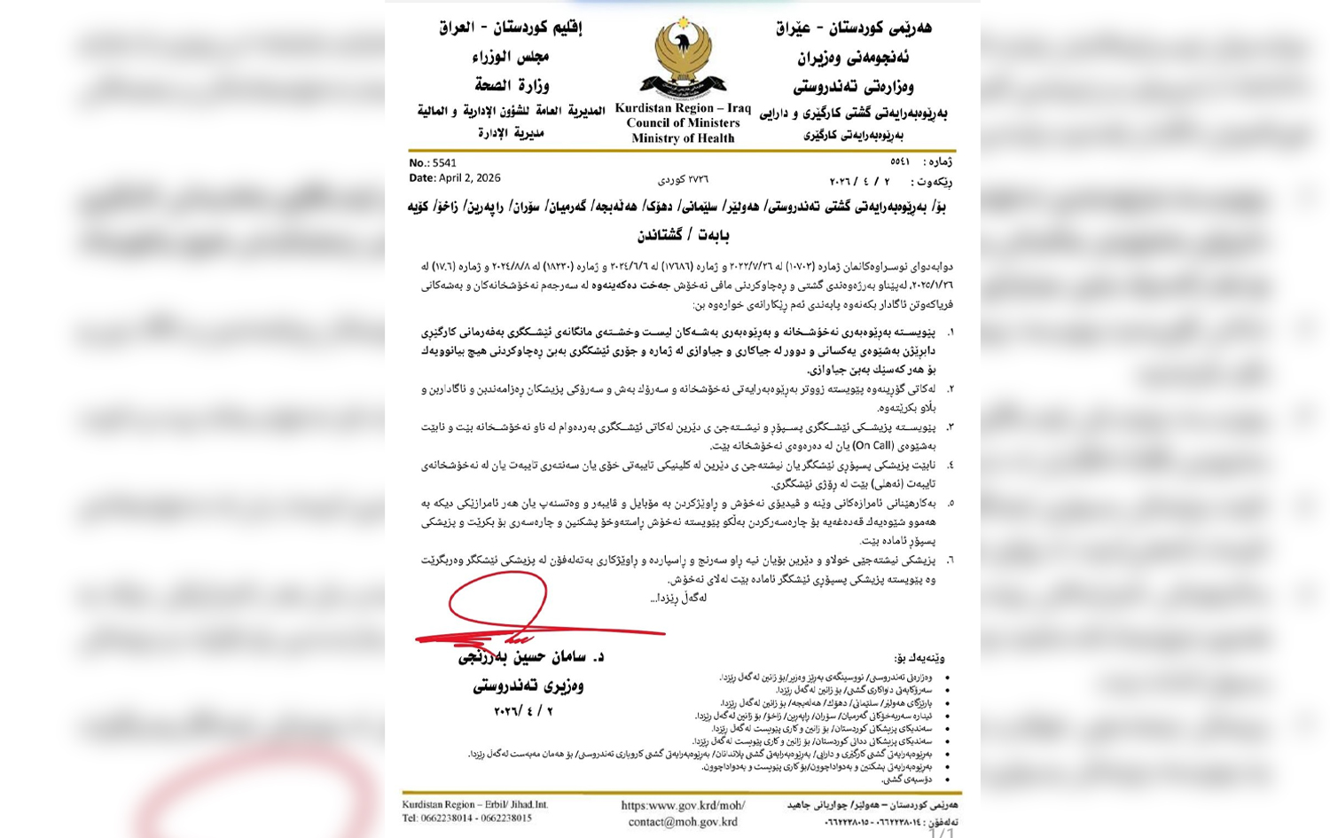 ئەو راگەیێنراوە لە سەرەتای ئەم مانگەوە بە واژۆی د. سامان بەرزنجی، وەزیری تەندروستیی هەرێمی کوردستان دەرچووە و هەموو بەڕێوەبەرایەتییەکانی تەندروستیش بڵاویان کردووەتەوە.