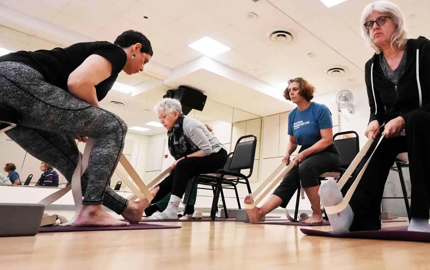 ناوەندێکی وەرزشیی جەستەییە لە نیویۆرک و تەکنیکێکی نوێ بە بەکارهێنانی کورسی بۆ یۆگای بەساڵاچووان تاقیدەکرێتەوە.