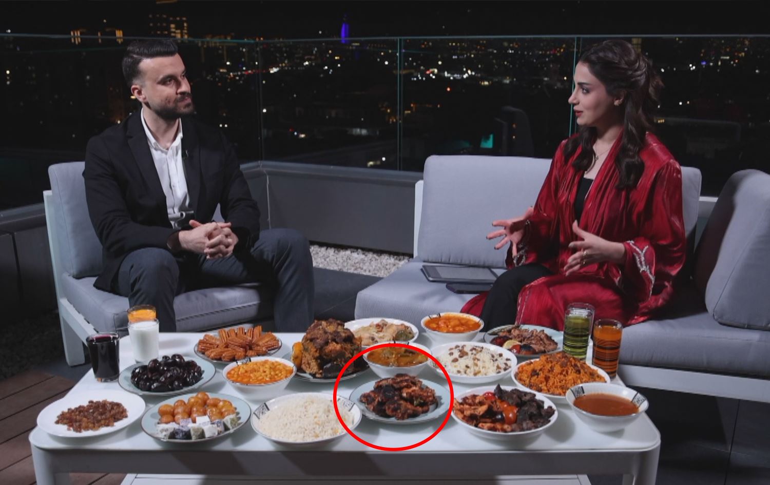 دکتۆر لونا لەگەڵ د. شێرزاد لەنێو ئۆفیسی رووداو لە سلێمانی مێزێکی پڕ لە خۆراکیان لەبەردەمە.
