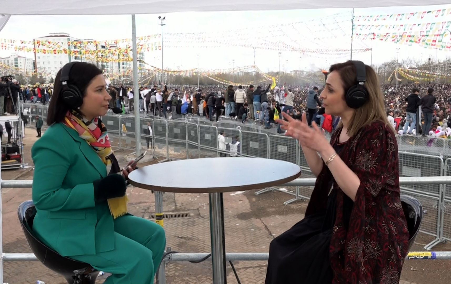 ئایشەگوڵ دۆغان: گۆڕەپانەکە پڕبووە. هەموو ئەو ناوچانەی ئێمە چووین خەڵک جۆشێکی زۆر گەورەی هەیە، لە ئامەد لە سەرەتادایە بەڵام شوێن نەماوە، لەکاتێکدا ئەوانەی لە دەوامدان و ئەوانەی لەکاریشدان نەیانتوانیوە بێن. دوێنێ پڕۆژەیاسایەکمان دایە پەرلەمانی تورکیا کە 21ـی ئازدار بە فەرمی ببێتە جەژنی گەلی کوردستانی و گەلانی رۆژهەڵاتی نێوەڕاست. کەشوهەواش خۆش نییە شوێن نەماوە، ئەم ئامادەبوون و بەجۆشییە دەبێت لەلایەن بەرپرسانیشەوە وەکو پەیامێک ببینرێت. ئەم خاوەندارییە لە خۆییەوە نییە و ئەمە خاوەنداریکردنە لە بانگەوازیی چارەسەری و ئاشتی و رێورێبازی سیاسەتی دیموکراسی؛ پێویستی ئێمە ئێستا بە فراوانکردنی ئەمەیە. بەڵام ئێستا زیندانیکراو و بێسەروشوێن هەن و خەڵکێکی زۆر لێرە لەلایەکەوە خەمگینە و لەلایەکیشەوە ئاهەنگ دەگێڕێت. لە مێژووەوە بۆ ئێمەی کورد شایی و شین پێکەوە بووین، کە شیاوی گەلی کورد نین.