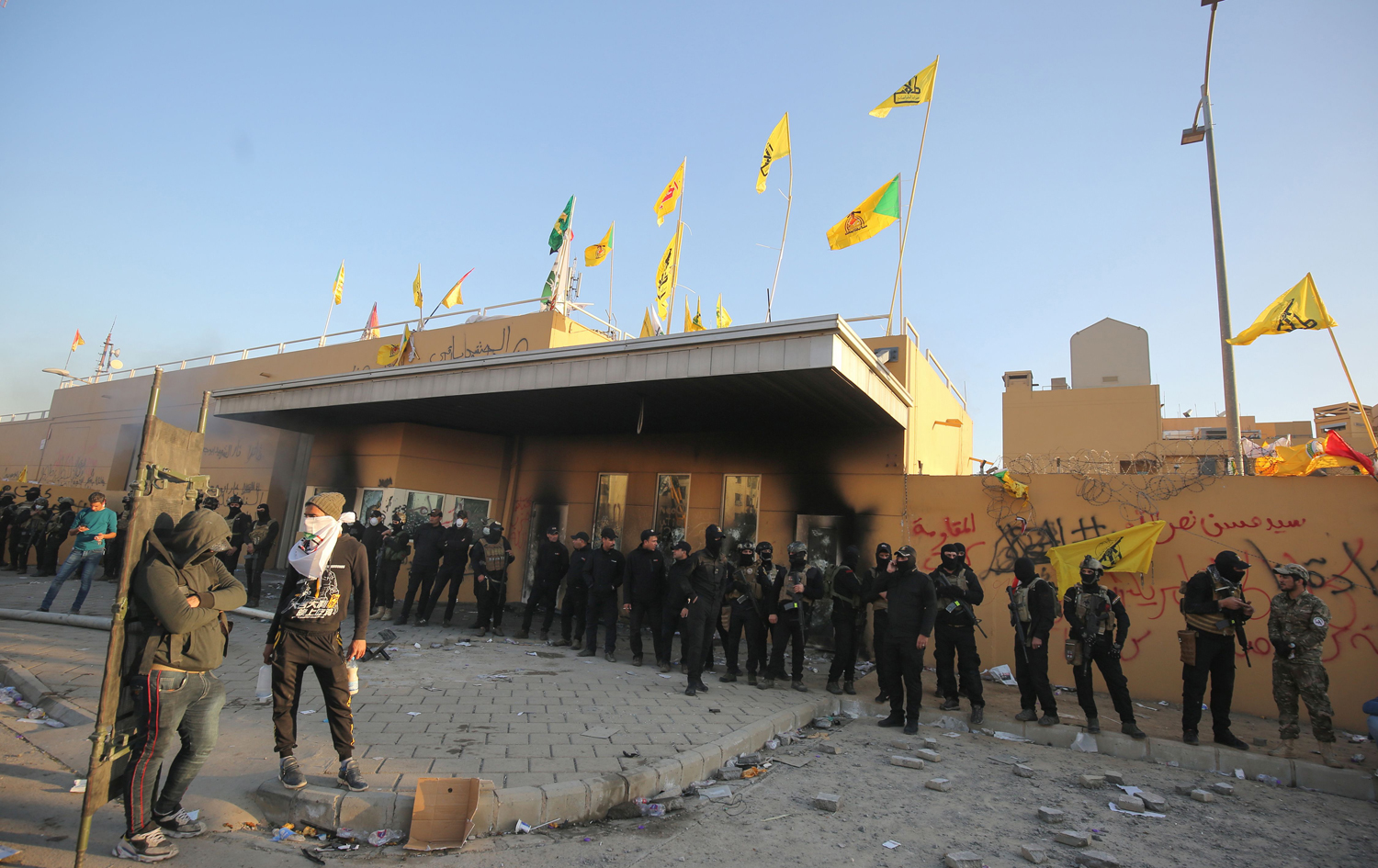 رۆژی سێشەممە چەکدار و لایەنگرانی حەشدی شەعبی لە کاردانەوەی هێرشەکانی ئەمریکا بۆسەر بنکە و بارەگاکانی حەشدی شەعبی کە نزیکەی 30 کوژراو و 50 برینداری لێکەوتەوە هەڵیانکوتایە سەر باڵیۆزخانەی ئەمریکا و داوایانکرد باڵیۆزخانەی ئەمریکا لە عێراق داخرێت، هاوکات درووشمی "مەرگ بۆ ئەمریکا" و چەندین درووشمی دیکەی دژ بە ئەمریکایان بەرزکردەوە.