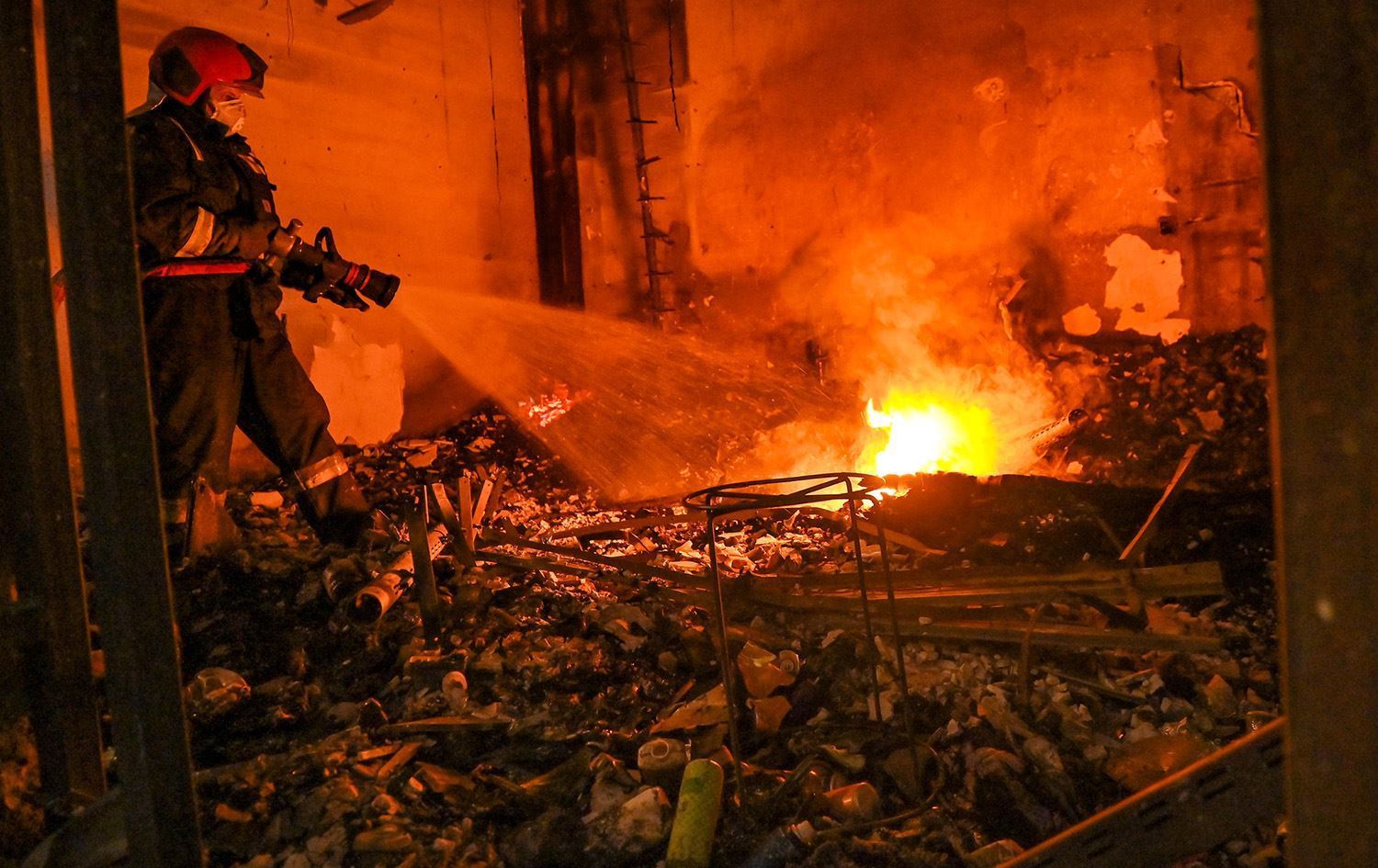 کارمەندێکی بەرگریی شارستانی لەکاتی کوژراندنەوەی ئاگری بازاڕی لەنگەی هەولێر. وێنە: بڵند تاهیر- رووداو