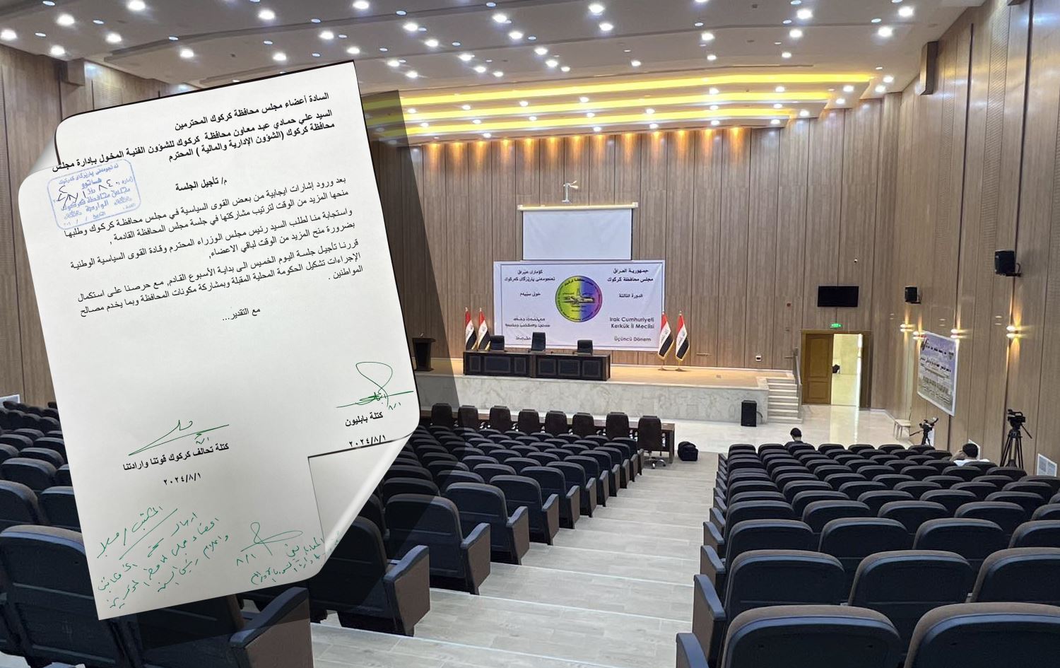 هۆڵی کۆبوونەوەکانی ئەنجوومەنی پارێزگای کەرکووک و نووسراوەکەی فراکسیۆنی هاوپەیمانیی کەرکووک هێز و ئیرادەمانە