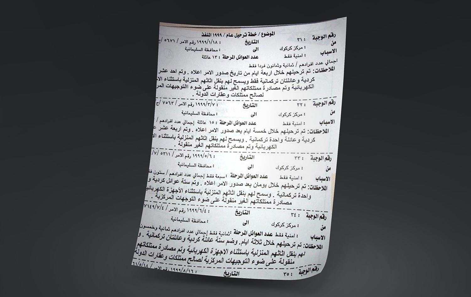 بەڵگەنامەیەکی نوێی مێژوویی، کە بۆ ساڵی 1999 دەگەڕێتەوە، وردەکاریی پلانی راگواستن، بەعەرەبکردنی پلان بۆ داڕێژراو و کۆچپێکردنی بەزۆری خێزانە کورد و تورکمانەکانی کەرکووک ئاشکرا دەکات. ئەم بەڵگەنامانە تیشک دەخەنە سەر پاساوەکانی ئەو پرۆسەیە، ژمارەی خێزان و کەسە زیانلێکەوتووەکان و چارەنووسی موڵک و ماڵیان.