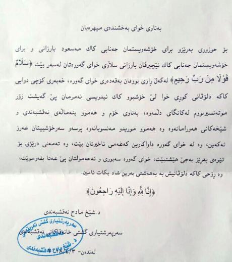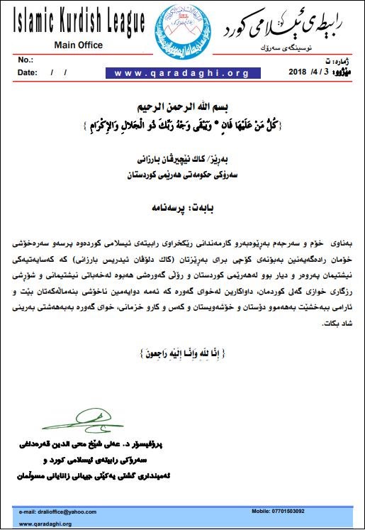 بەم بۆنە خەمناکەوە پرسەو سەرە خۆشی خۆمان ئاراستەی ( جەنابی سەرۆک بارزانی ) و ( رێزدار نێچیرڤان بارزانی ) سەرۆکی حکومەتی ھەرێمی کوردستان دەکەین ، لە خوای گەورە دەپارێینەوە بە بەھشتی خۆی شاد بکات،