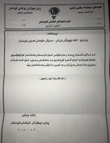 سەرۆکی هێژا رێزدار مەسعود بارزانی، جەنابی سەرۆکوەزیران رێزدار نێچیرڤان بارزانی.پاش سڵاوێکی گەرم، خەمی کۆچی دوایی جوانەمەرگ دلۆڤان بارزانی لەم کات و ساتەدا تووشی خەمەکی گرانی کردین.
