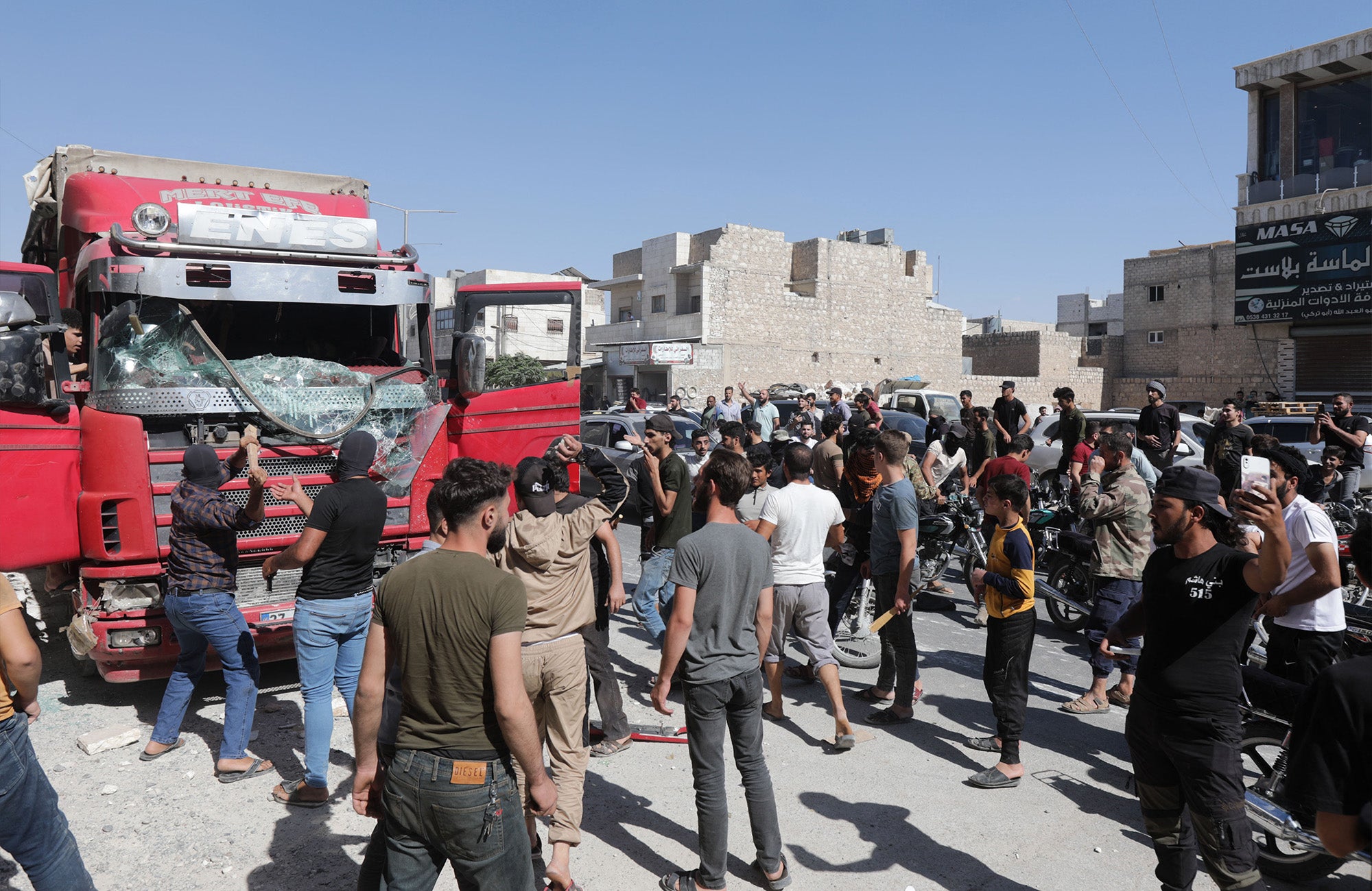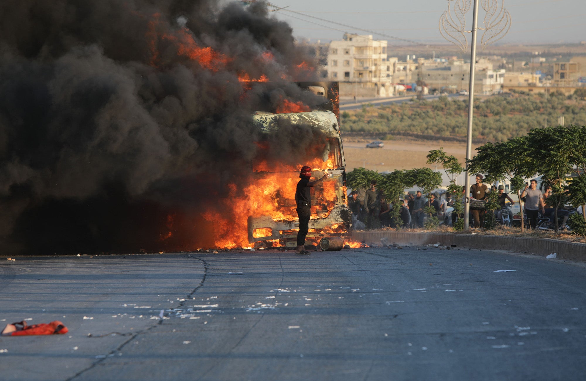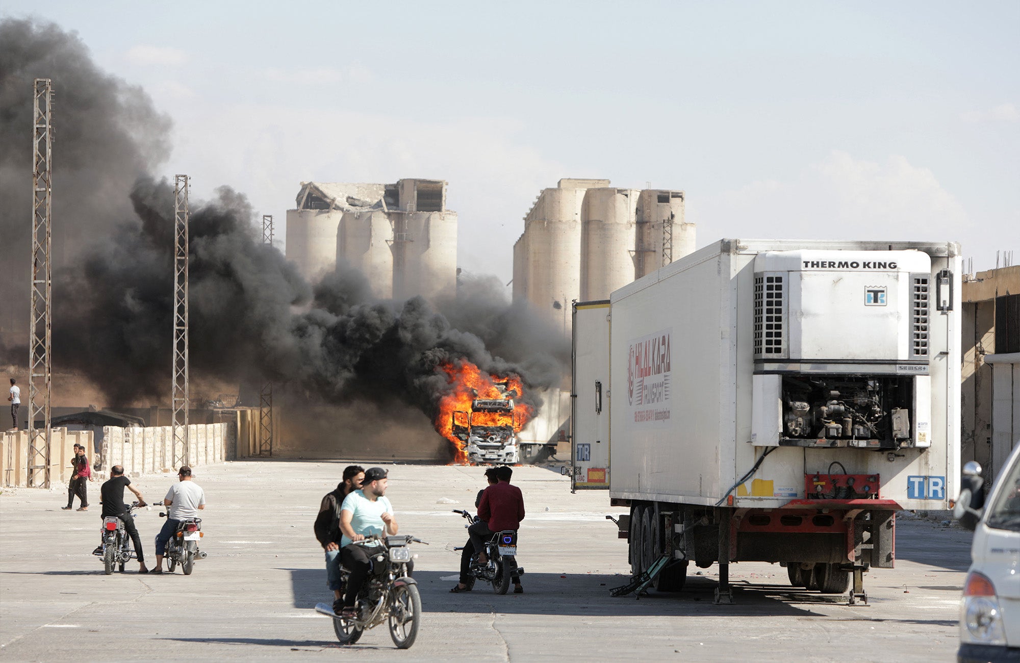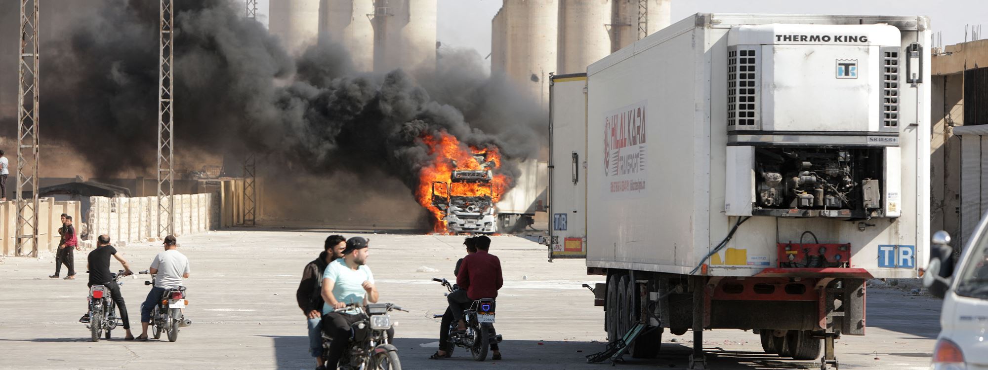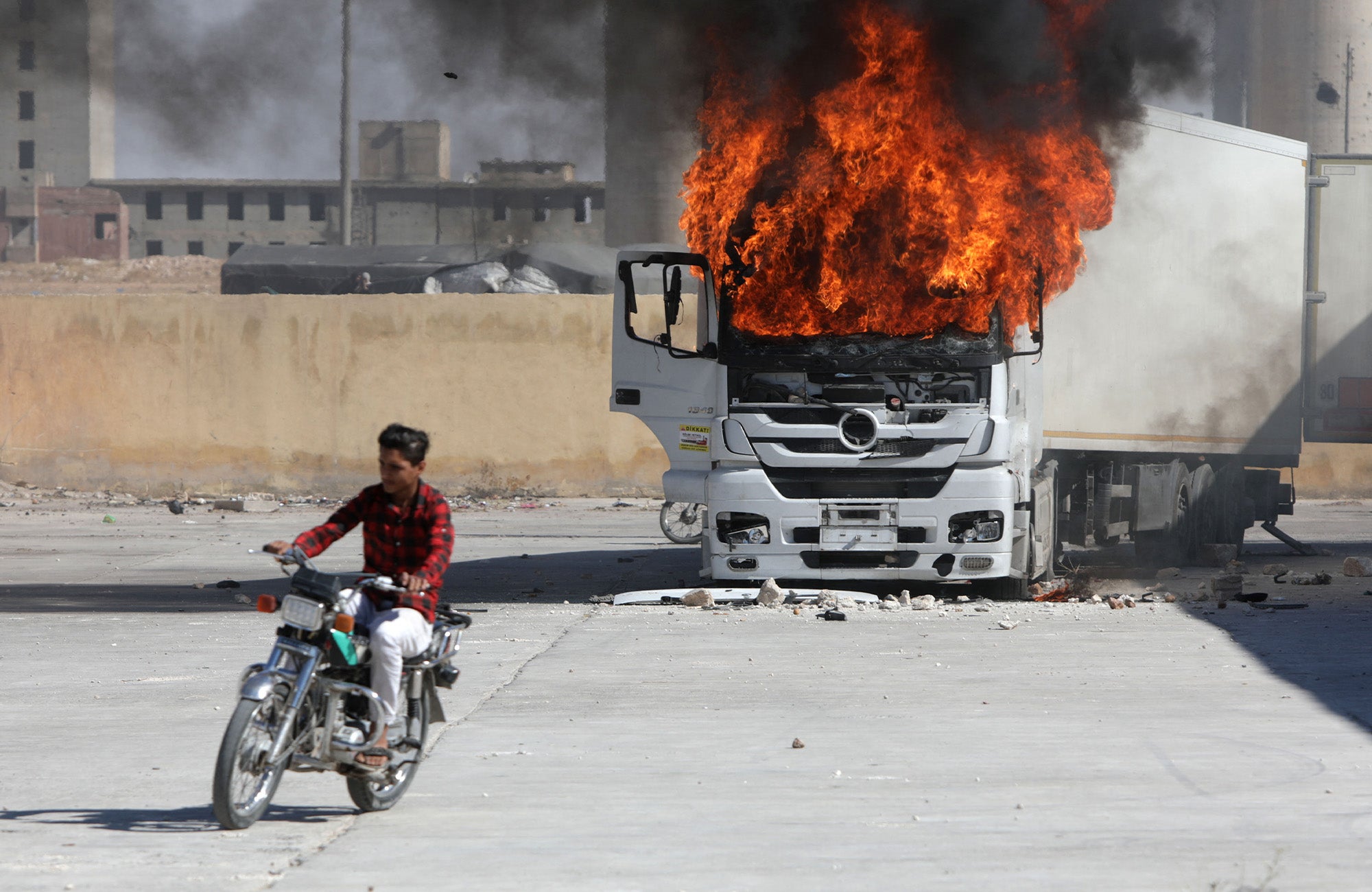 بەگوێرەی سەرچاوە خۆجێیەکان و ئەو دیمەنانەی ئاژانسی فرانس پرێس بڵاویکردوونەتەوە، خۆپێشاندەران دەروازەی سەرەکیی شاری ئەلبابیان لە بەردەم بارهەڵگرەکانی تورکیا داخستووە و هێرشیان دەکەنە سەر و بەشێکیان دەسووتێنن.